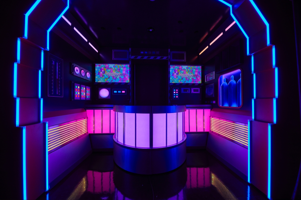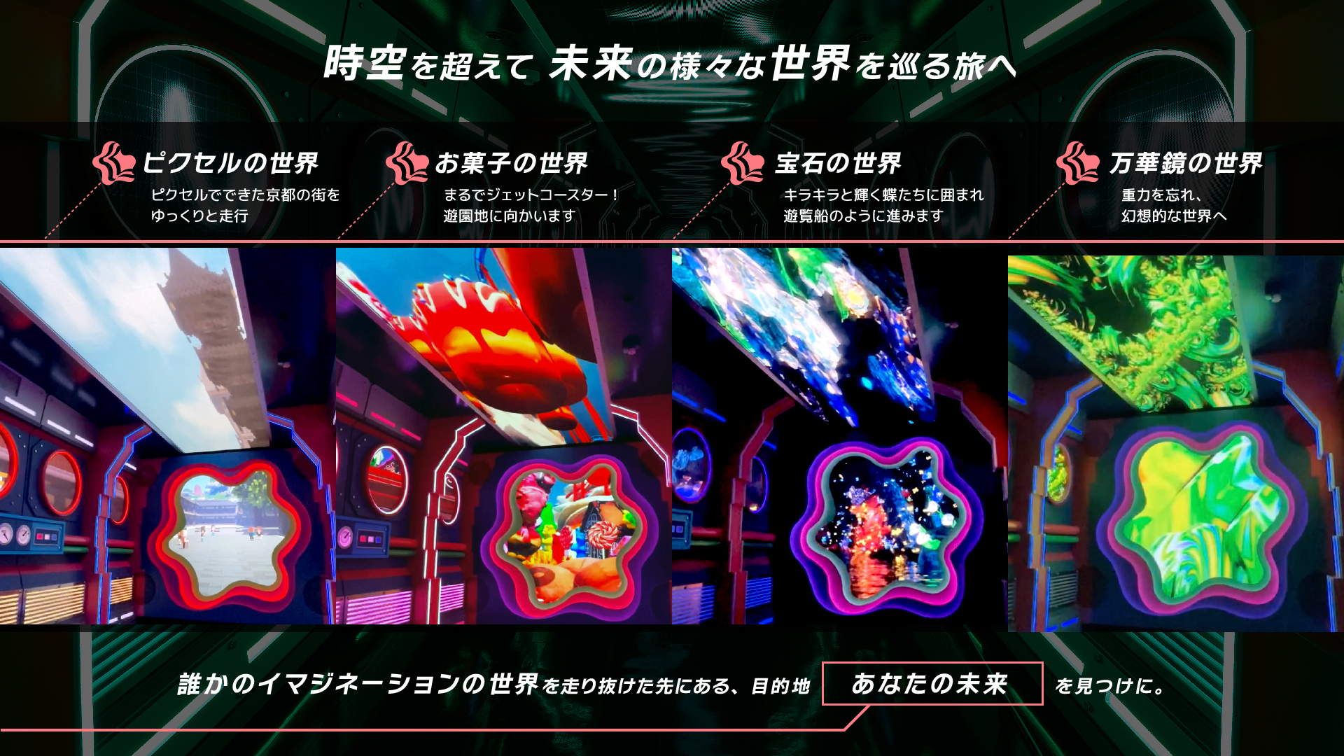 音と光で彩る時空旅行体験は、日本のKawaii文化の第一人者であるアーティスト・増田セバスチャンとデジタルクリエイティブを強みとする株式会社IMAGICA EEXとのコラボレーションで誕生。レトロフューチャーな装飾とCG・電飾・音響を立体的に組み合わせた演出により、乗客を特別な物語へと誘います。