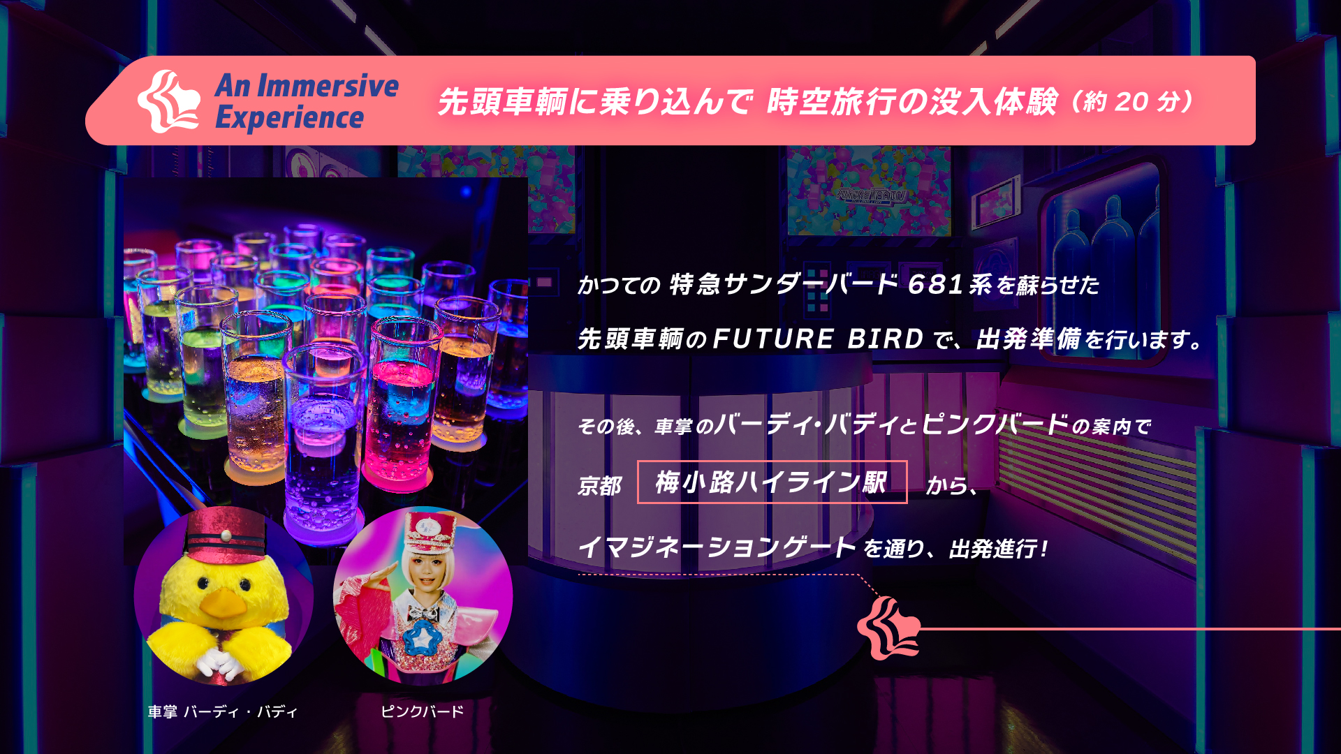 旅の案内人は、ふたりのオリジナルキャラクター。未来から派遣された車掌の「バーディ・バディ」は、大きなピンクの帽子とカラフルな尾が目印。ピンクの羽を持つ「ピンクバード」はアテンダントとして、車掌とともに、時空を超えた未来の旅へと、お客様をご案内いたします。