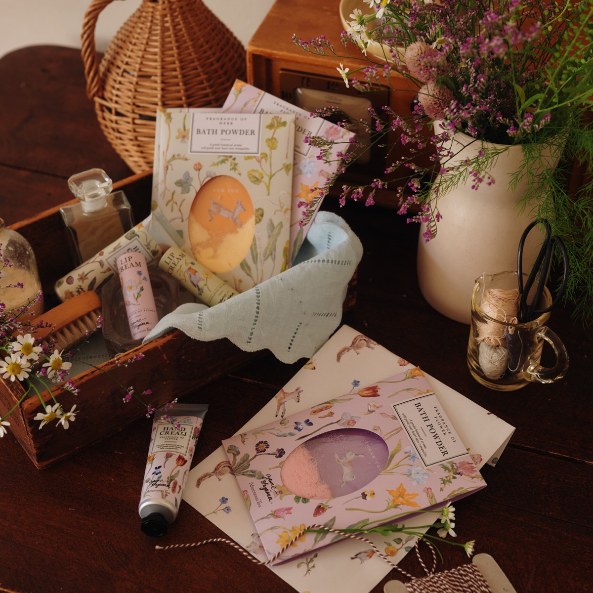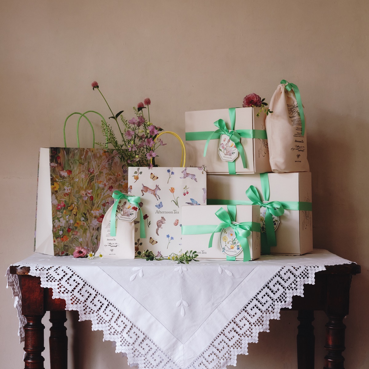 庄島歩音氏の春の訪れを感じるアートをあしらった限定ラッピングが、1月21日(水)より登場します。華やかなショッパーやタグカードに加え、ギフトにぴったりなコットン巾着とボックスのリボンを、春限定のグリーンでご用意しました。春のやわらかな色合いと、動植物をモチーフにしたデザインが季節の心地よさをそっとお届けします。