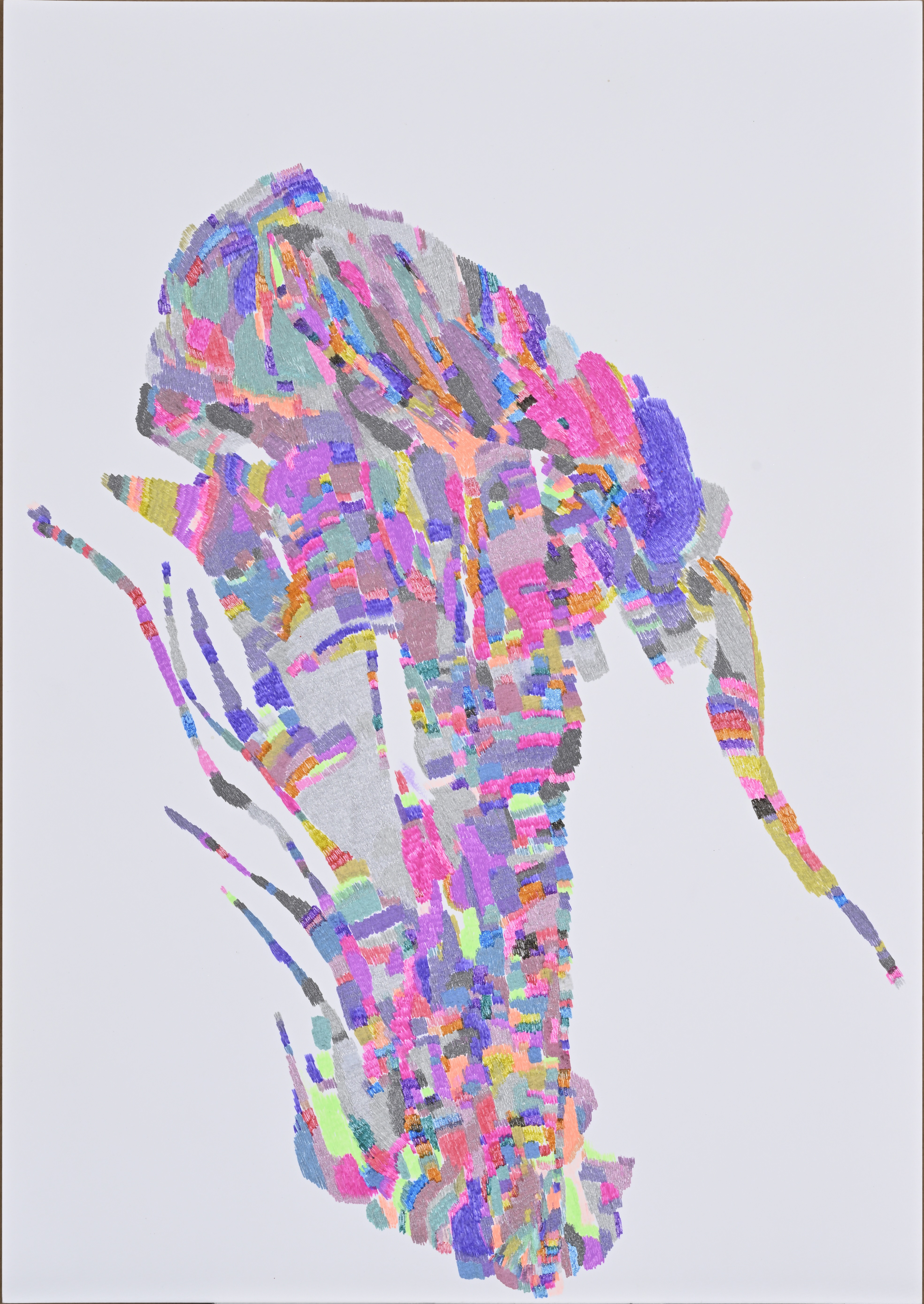 身近にあるものや、街を行き交う乗り物たち。日常にあるモチーフを写真と向き合うことで一度「分解」し、豪快な下絵として紙の上に現す。その線を尊重したり、あえて裏切ったりしながら、数色のクレヨンで色を重ねていき、写真の色味に縛られない、彼独自の色彩が差し込まれる。お気に入りの色を手に取り、ぐりぐりと塗り込む動きには迷いがなく、その表情には描くことの確かな手応えがにじむ。「みんなに見てもらえるものを描くこと」。そう語る言葉の奥に、描くことを通して世界とつながる歓びがある。
