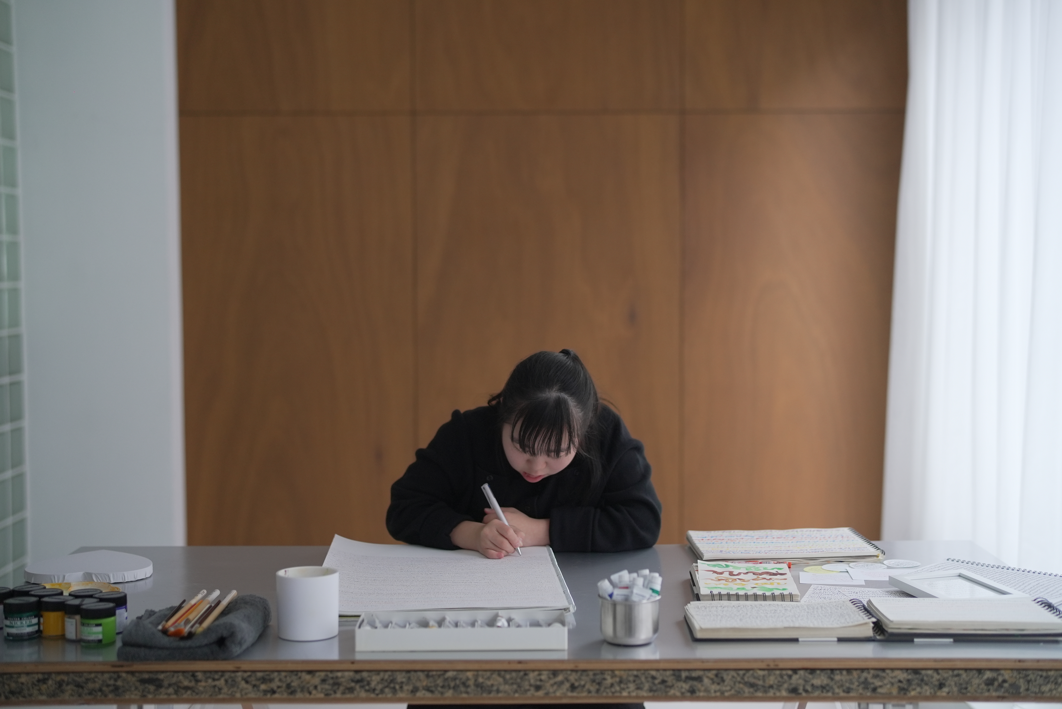 お寿司やゲーム、料理、そして絵を描くことを楽しみ、12歳から創作活動を続けている。なかでも情熱を注いでいるのが、ノートにびっしりと描き連ねる独自の「文字のようなもの」である。それは古代の碑文や宇宙の暗号、未来の言語を連想させるタイポグラフィであり、流れるように走り書かれた筆跡は見る者ごとに異なる解釈を促す。意味を求める人々の想像力の数だけ、新しい物語が紡がれていく。
