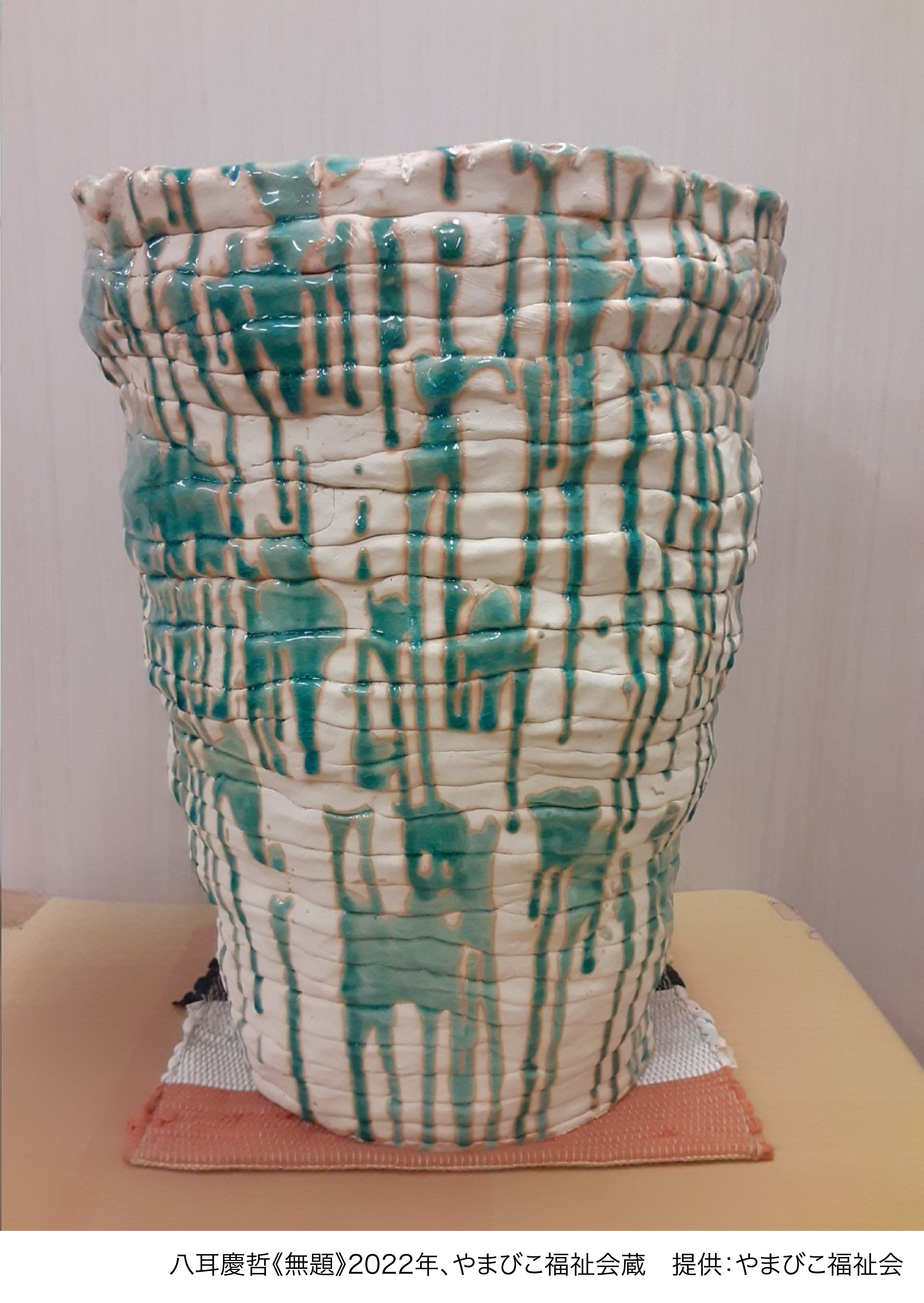 やまびこ作業所(滋賀県)に所属し、闘病を続けながら陶芸作品を制作した。全盲の八耳は、手のひらの感覚を頼りに、紐状に伸ばした粘土を積み重ね、作品を作り上げた。病状が進行し、制作を続けることが難しくなったが、体力が持つ2時間を開催期間として、2024年11月に展覧会「again,」を開催した。主な展示に「やまびこ展」(2024年、滋賀、竜王町公民館)がある。
