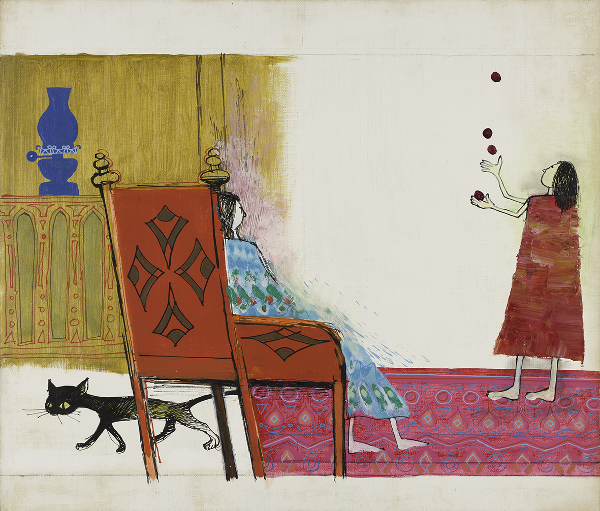 2.正⽥壤(1928-2016)太⽥市⽴新⽥図書館蔵、『まっかっかなむすめがまどからのぞいている』絵本原画 1973年、油彩、カンヴァス 53.0×45.5cm