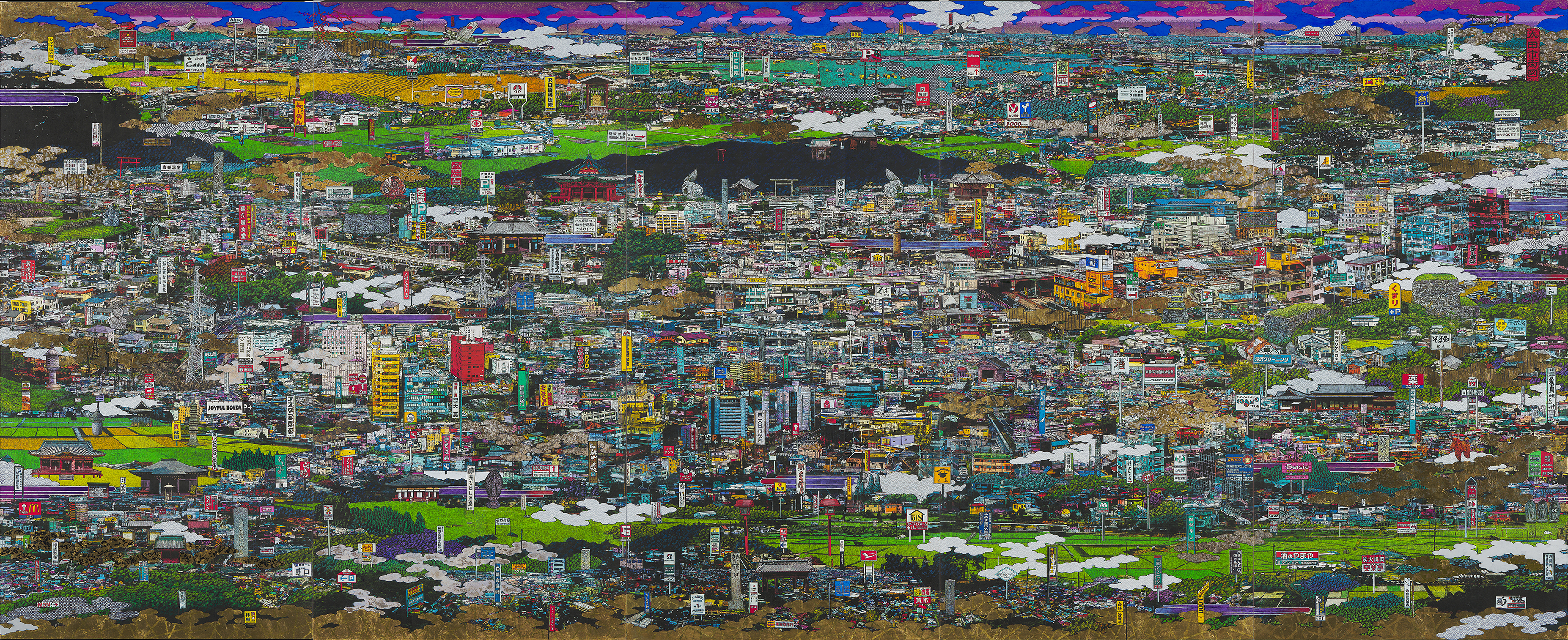 6.藤原泰佑(1988-)《太⽥市街図》2017年、アクリル、和紙、顔料、箔、パネル 186.0×455.0cm