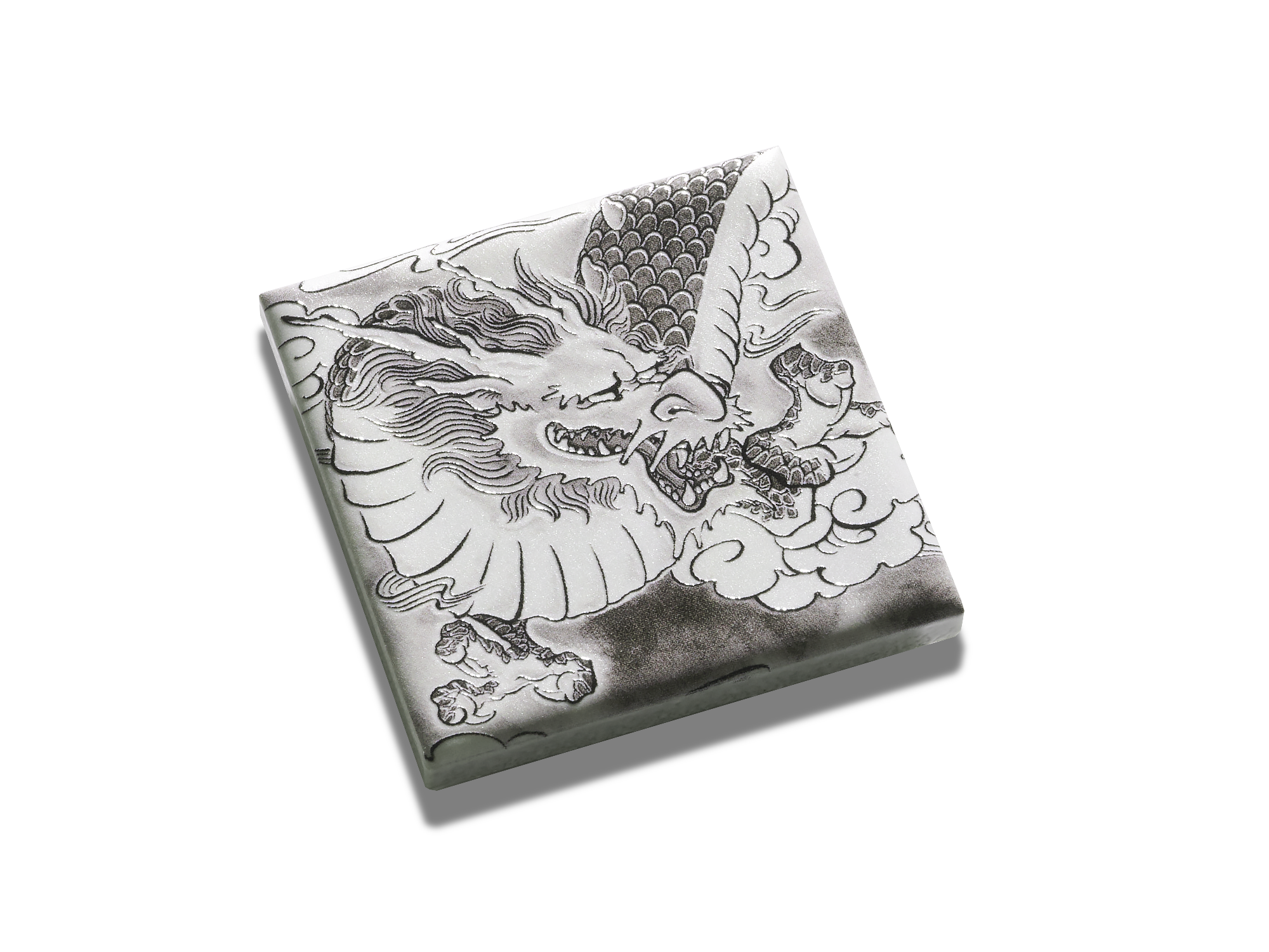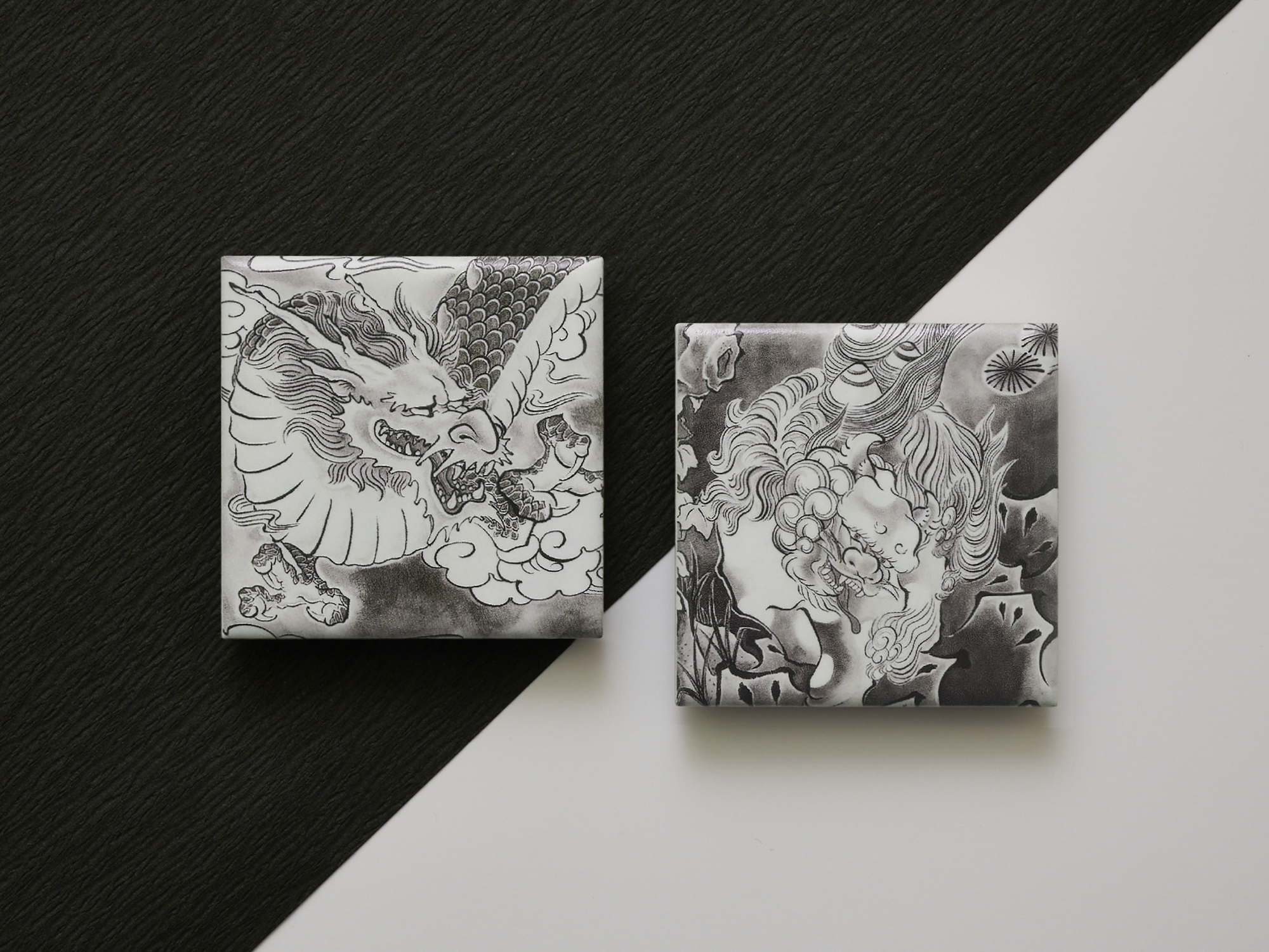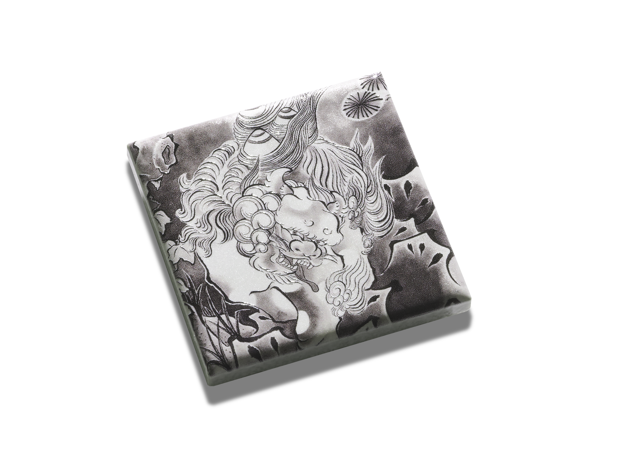 今にも動き出しそうな獅子の毛並みの一筋一筋が浮かび上がるように、細部まで緻密な凹凸を施しました。水墨画ならではの力強い筆致と、その奥にひそむ静けさ、その両方が伝わるように、艶のある濃墨の部分と、ざらりとしたマットな質感を使い分けています。視覚と触覚の両方で楽しめる、奥行きのあるテクスチャを追求しました。手に取った瞬間、獅子の気配や作品の迫力が浮かび上がるように感じていただけるアイテムです。