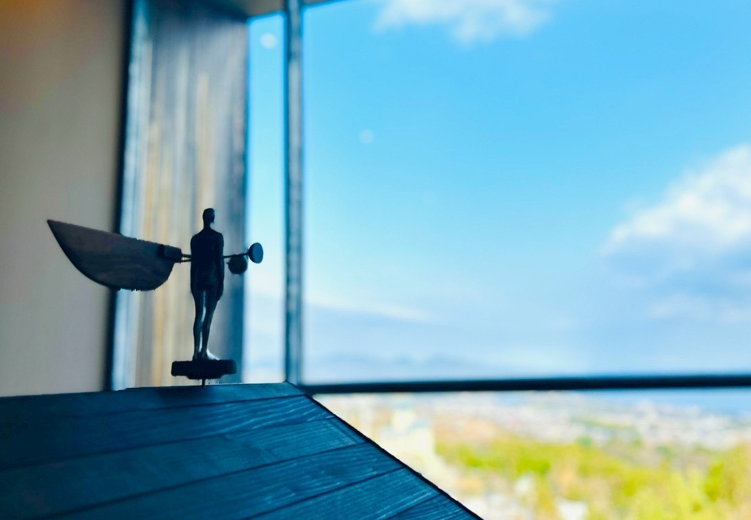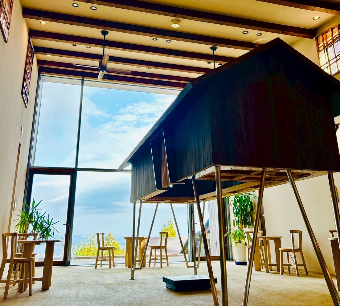 「風見書架」と名付けられた小さな小屋には、海を見渡せる窓があり、本やアート作品が飾られています。屋根には風見鶏をモチーフにしたオブジェが置かれ、目の前に広がる世界を見つめています。小屋は自由に出入りでき、滞在中は読書や展示作品を鑑賞できます。小屋からの眺めもアート作品の一部となっています。このアート作品が、別府での滞在をより一層思い出深いものにしてくれることを願っています。
