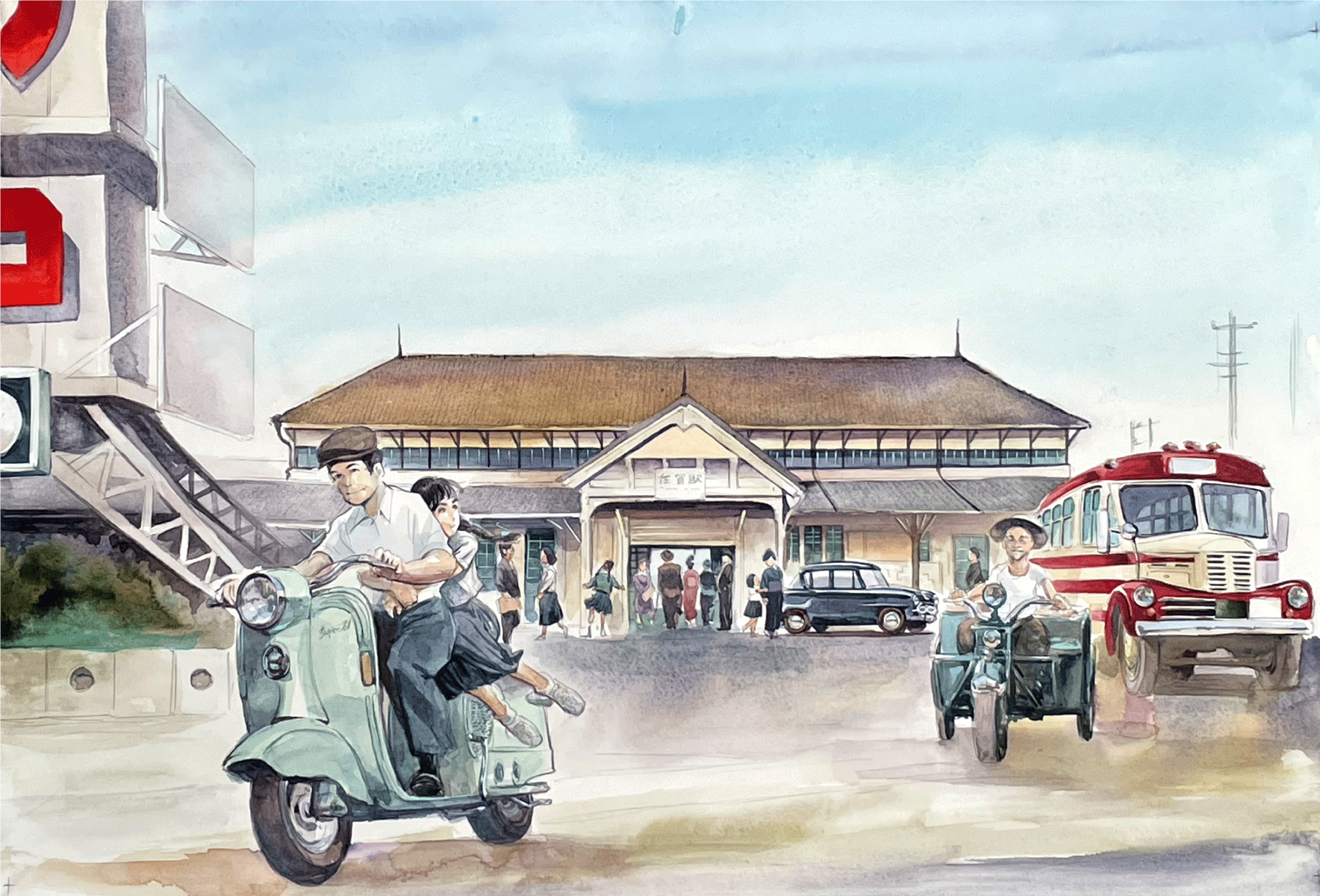 東佐賀駅〜“貫通道路”国道旧34号線を横断する旧佐賀線の名物駅でした。この周辺は過去自動車に関する販社などが多く、嘉瀬町に自動車関係の会社が集中する前は佐賀のモールタウンになり得たのではとも思わせる町でした。作画にあたって、高架の色味がわからずSNSに問いかけましたところ赤系と緑系に意見が分かれてより悩ましくなりました(近隣の方の証言と作者の記憶、加えて絵の「映え」から「赤系説」をとりましたが、緑系に塗られた時期があったのではと証言を集めているところです)。