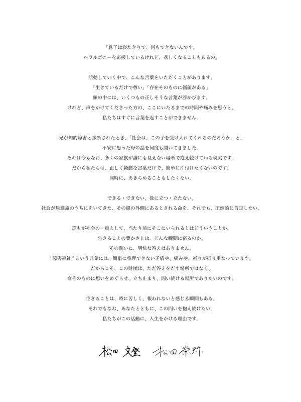 ヘラルボニー財団の創立には、株式会社ヘラルボニーの創業者である松田崇弥・文登が抱き続けてきた、「兄が幸せに生きる社会」を願う想いがあります。