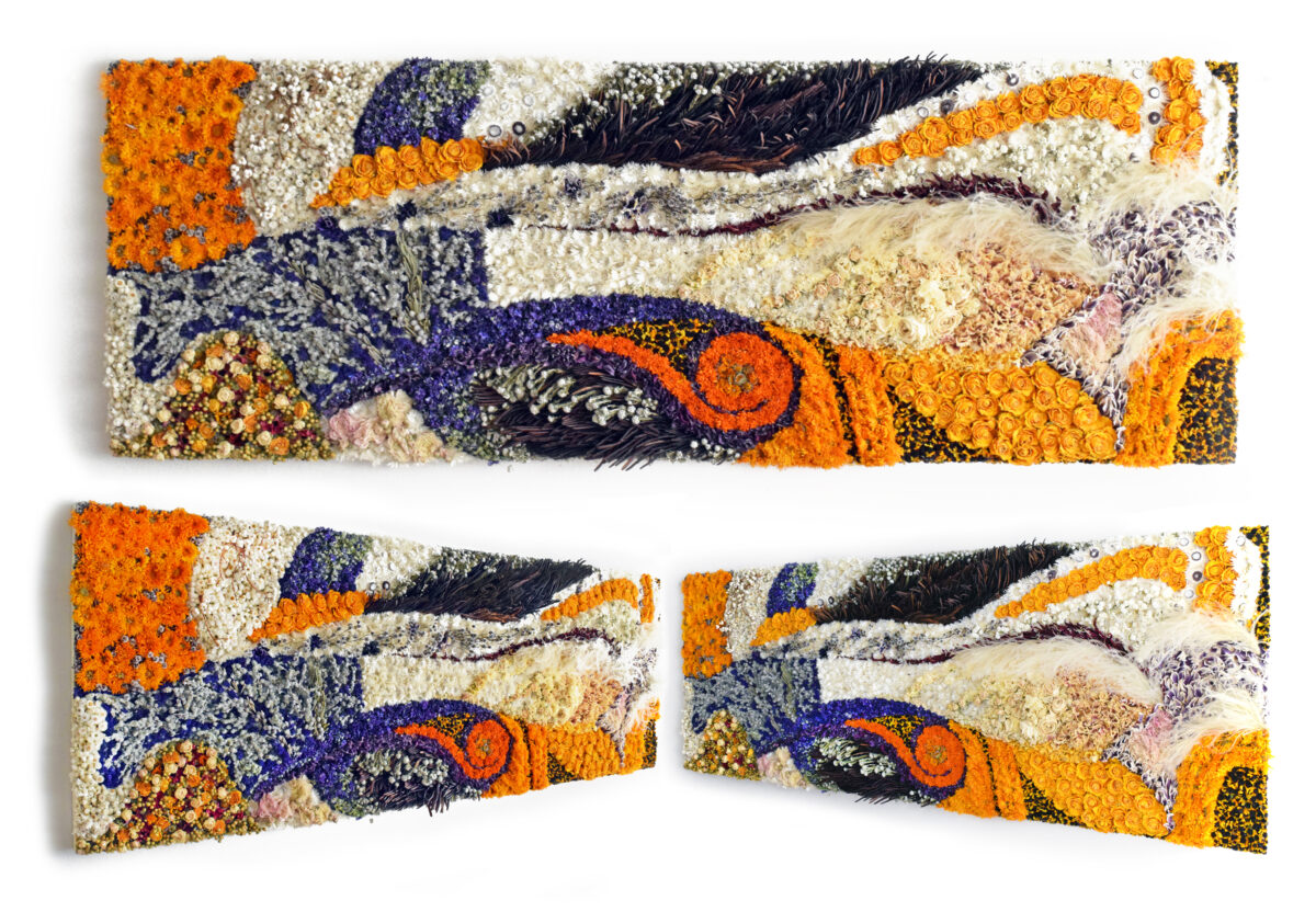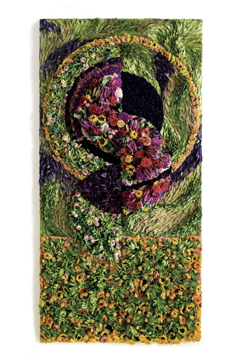 「花で描く絵画」をコンセプトに花を絵の具のように使い、花びら、葉、茎を一枚一枚油絵のように重ねて制作します。