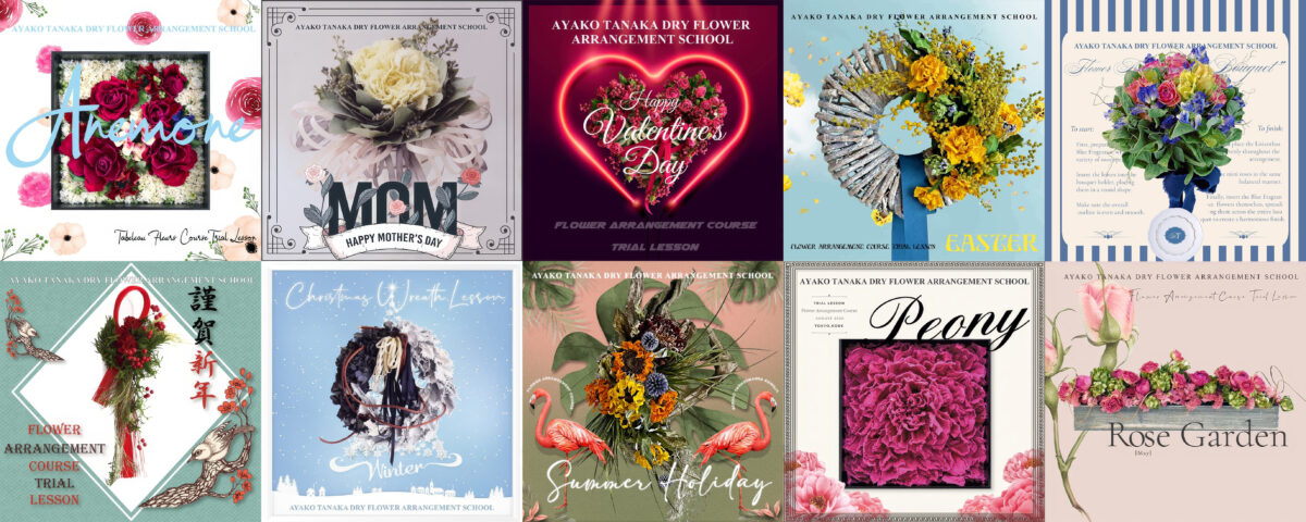 どちらのコースも初、中、上級のクラス、講師を目指すクラス、毎年異なるカリキュラム(小説、人物、建築、天候など)を学び、それらを題材に自由に制作するクラスがあり、知的好奇心を刺激し学んだことを季節の花で表現する大人のスクールです。