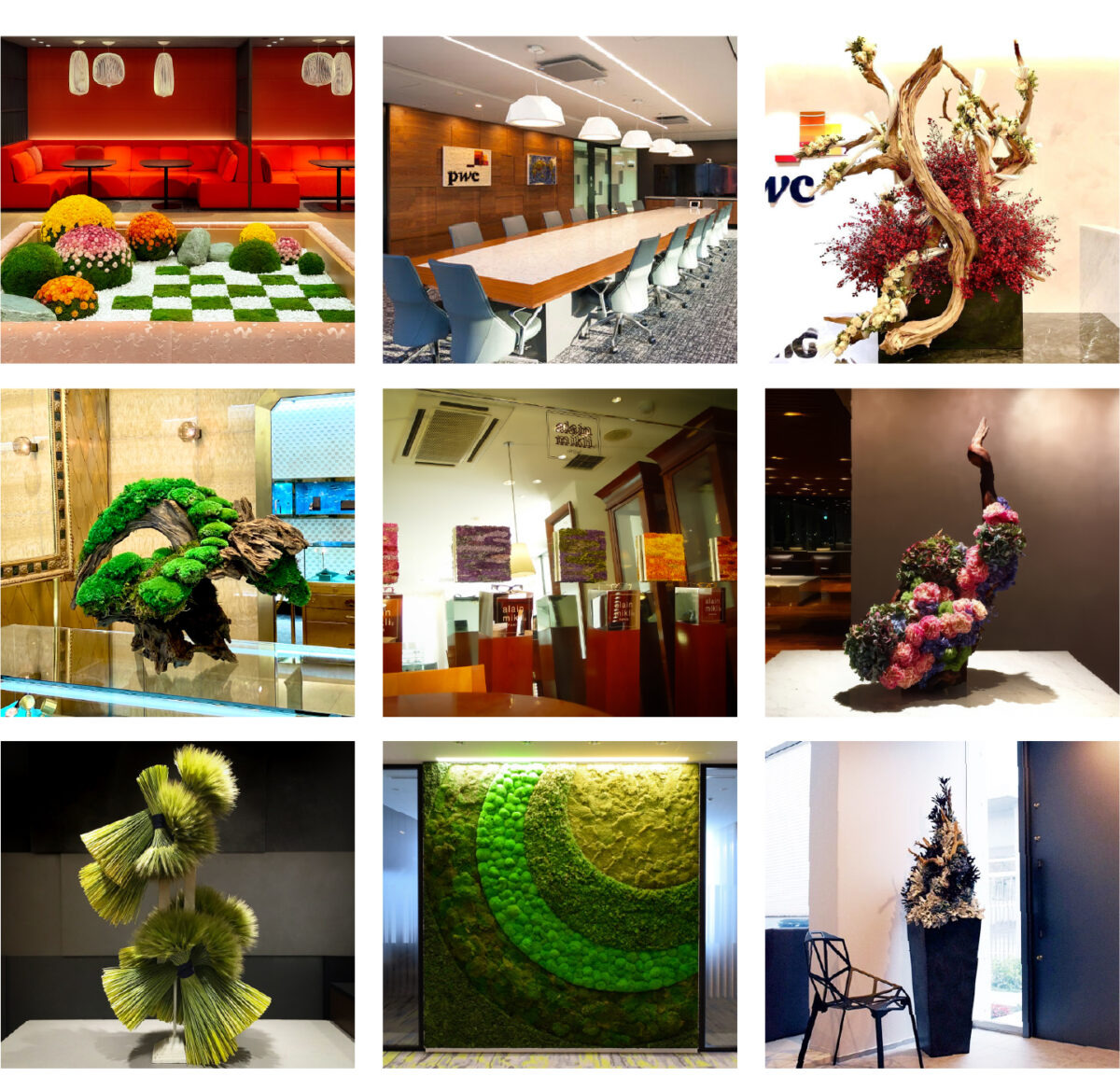 私たちは「Unparalleled Art with Flowers(比類なき花のアート)」というミッションのもと、コンセプト開発から制作・設置まで行っております。生花と比べ、長く続く美しさと最小限のメンテナンス性でご好評いただいており、なかでも苔を用いた作品はメンテナンスを必要とせず、日本庭園や盆栽の洗練された美意識を現代的に再解釈し、空間に独自の雰囲気をもたらします。世界的に評価される日本発のアヴァンギャルドなブランドから、歴史と伝統を誇るグローバル企業まで、多岐にわたるご依頼をいただいております。