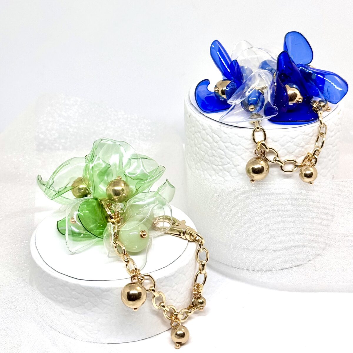 廃材を一つひとつアップサイクルした手作りのパーツを、素材の色を活かしながら組み上げた軽量のチャーム。