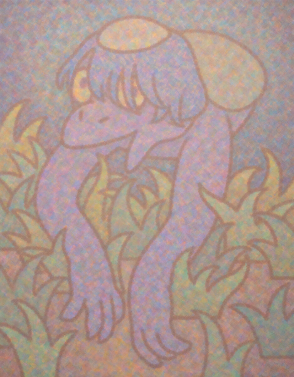 佐竹龍蔵(1987年高知県生まれ、奈良県在住)は、日本画材の岩絵具の透明感を生かした独自の点描法で描き、見る距離によって色や形が変化して見える人物画や風景画を描いています。近年は、生まれ育った高知県の四万十川に取材した風景画や、奈良の風景として吉野の左曽川を取材し妖怪や架空の生き物などのモチーフと組み合わせた作品を制作しています。