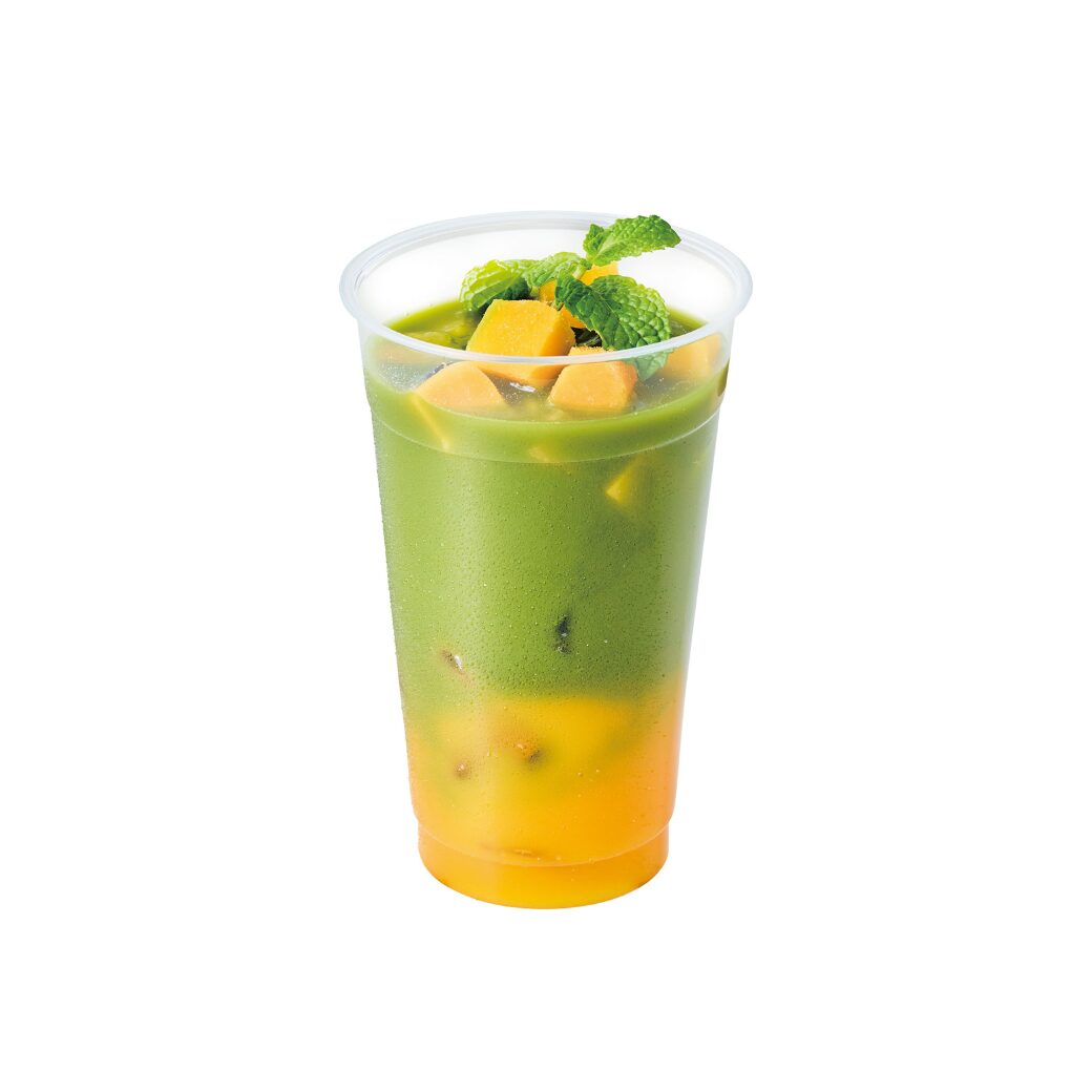 「抹茶×マンゴー」意外な組み合わせのドリンク。和の趣を感じる深緑とトロピカルな黄色が織りなす彩、一口ごとに表情を変える味をお楽しみください。