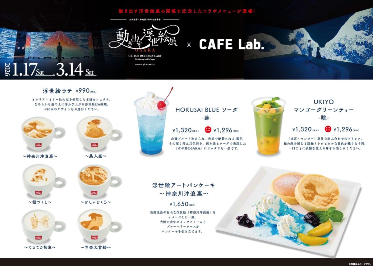 立体映像空間で浮世絵の世界に没入できる体感型デジタルアートミュージアム「動き出す浮世絵展 OSAKA」が1月17日(土)に開幕。開催期間中は作品鑑賞だけでなく、食でも浮世絵アートを堪能できるコラボメニューがナレッジキャピタル「CAFE Lab.(カフェラボ)」(グランフロント大阪 北館1階)に登場します!