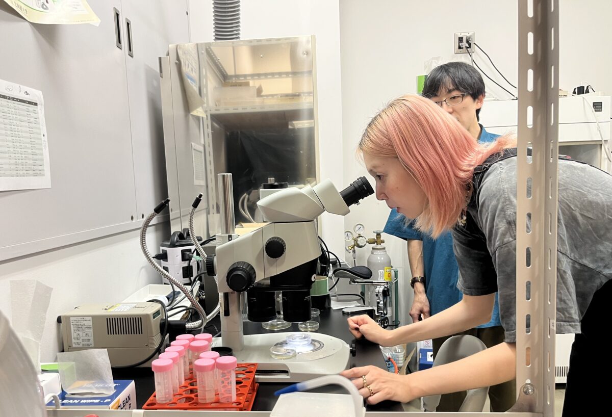 北海道大学の研究室にて顕微鏡で原生生物を観察する市原佐都子