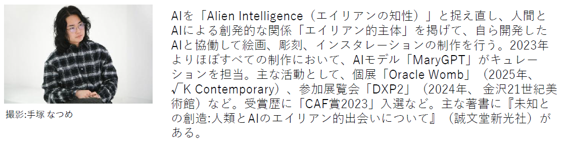 アート・インキュベーション・プログラムを通じて岸が開発中の「BI(Botanical Intelligence)」は、植物のふるまいをインターフェースとして、未知の知性との共創や対話を実験する、アートと研究開発が交差するプラットフォームです。そこで立ち上がる「植物的なインテリジェンス」のイメージは、AIを人間中心の枠組みから解き放ち、環境全体を巻き込んだ知のあり方を構想するための仮説でもあります。本シンポジウムでは、この問いを共有しながら、「人間だけに閉じないインテリジェンス」の姿と、それを前提にした社会・都市・表現の新しいかたちを探ります。