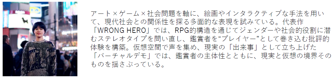 藤嶋咲子が取り組むプロジェクト「コエノクエスト —都市に残されたセーブデータ」は、都市に埋もれた声を可視化し、これまで交わることのなかった他者との対話の場を生み出すことで、世界の見え方に揺らぎを与えるゲーム作品を制作するプロジェクトです。ゲーム内に登場するアバターは、実在する都市生活者の語りをもとに生成され、プレイヤーはその営みや痛みに触れながら、自身の輪郭の外側にある価値観や生き方に出会っていきます。体験はインスタレーションとして展開され、記録された対話のログは再編集のうえ公開されます。年齢、性別、国籍、経済状況、思想などに起因する分断を背景に、すれ違う声が交差する状況から、新たなコモンズの可能性をひらく手がかりを探ります。