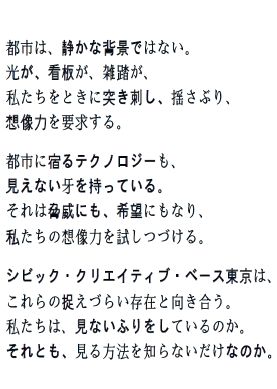 ようこそ、未来の実験区・東京へ。 「都市は、想像力を要求する。」それは単なるイマジネーションにとどまらず、クリエーションにつながり、社会に新しい仕掛けをもたらす力にもなります。これからのCCBTの活動をぜひ楽しみにしていてください。