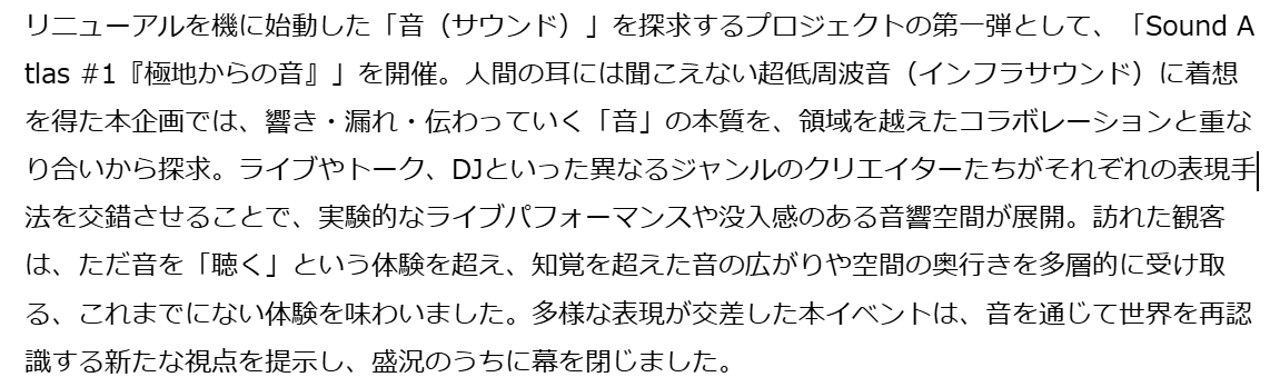 ■CCBT初の音楽イベントSound Atlas #1 「極地からの音」では、響き・漏れ・伝わっていく「音」の本質を領域を越えたコラボレーションと重なり合いから探求。