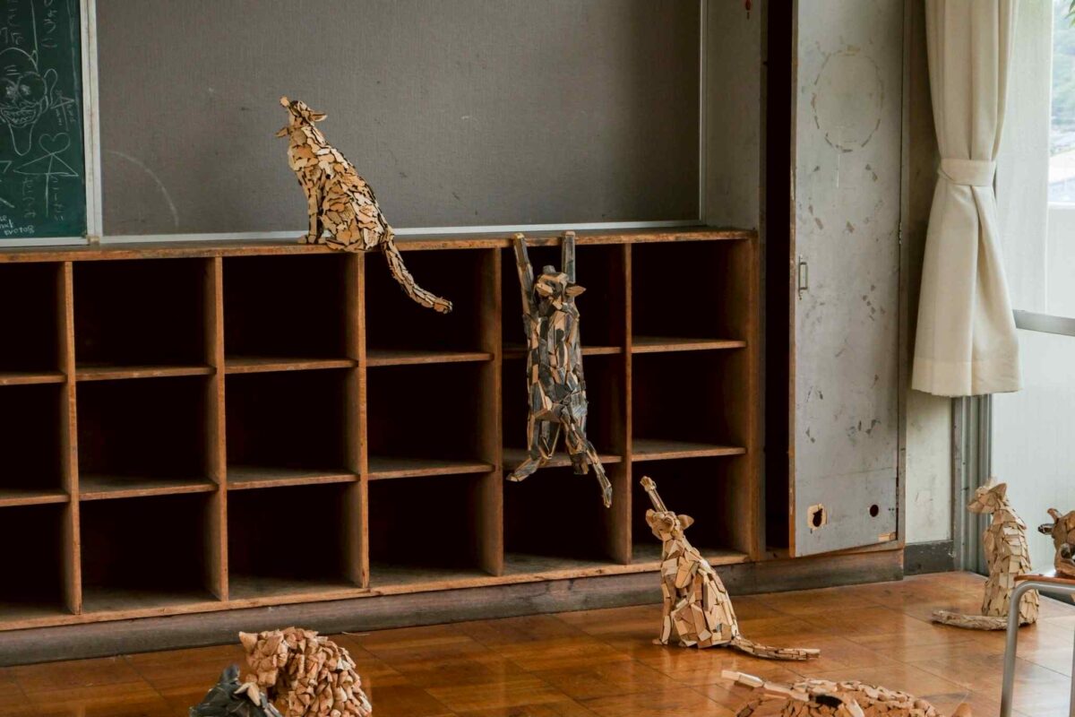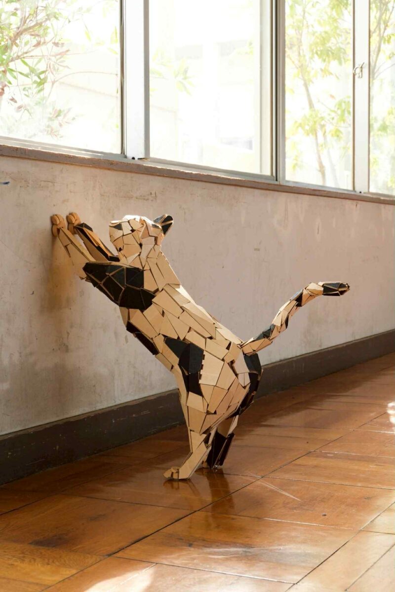使用するのは、流木や家具の端材、建築現場で出る余り木など、役目を終えた木材です。無骨で角ばった木のブロックをパズルのように組み合わせる独自の手法で、驚くほど柔らかく、生き生きとした動物の曲線美を生み出します。