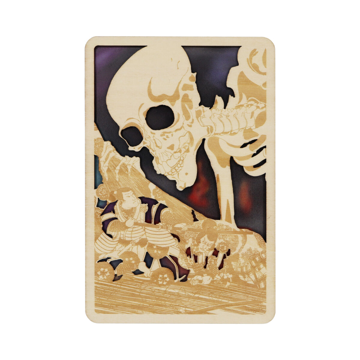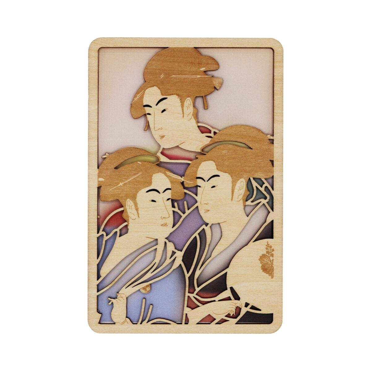 今回発売するのは、海外でも人気の高い、日本を代表する5人の浮世絵師(歌川国芳・歌川広重・葛飾北斎・喜多川歌麿・東洲斎写楽)の代表作をモチーフにした新作全6種類です。それぞれ表と裏で異なる作品がデザインされており、メッセージカードとしてはもちろん、付属のスタンドに飾ってオブジェとして楽しむこともできます。