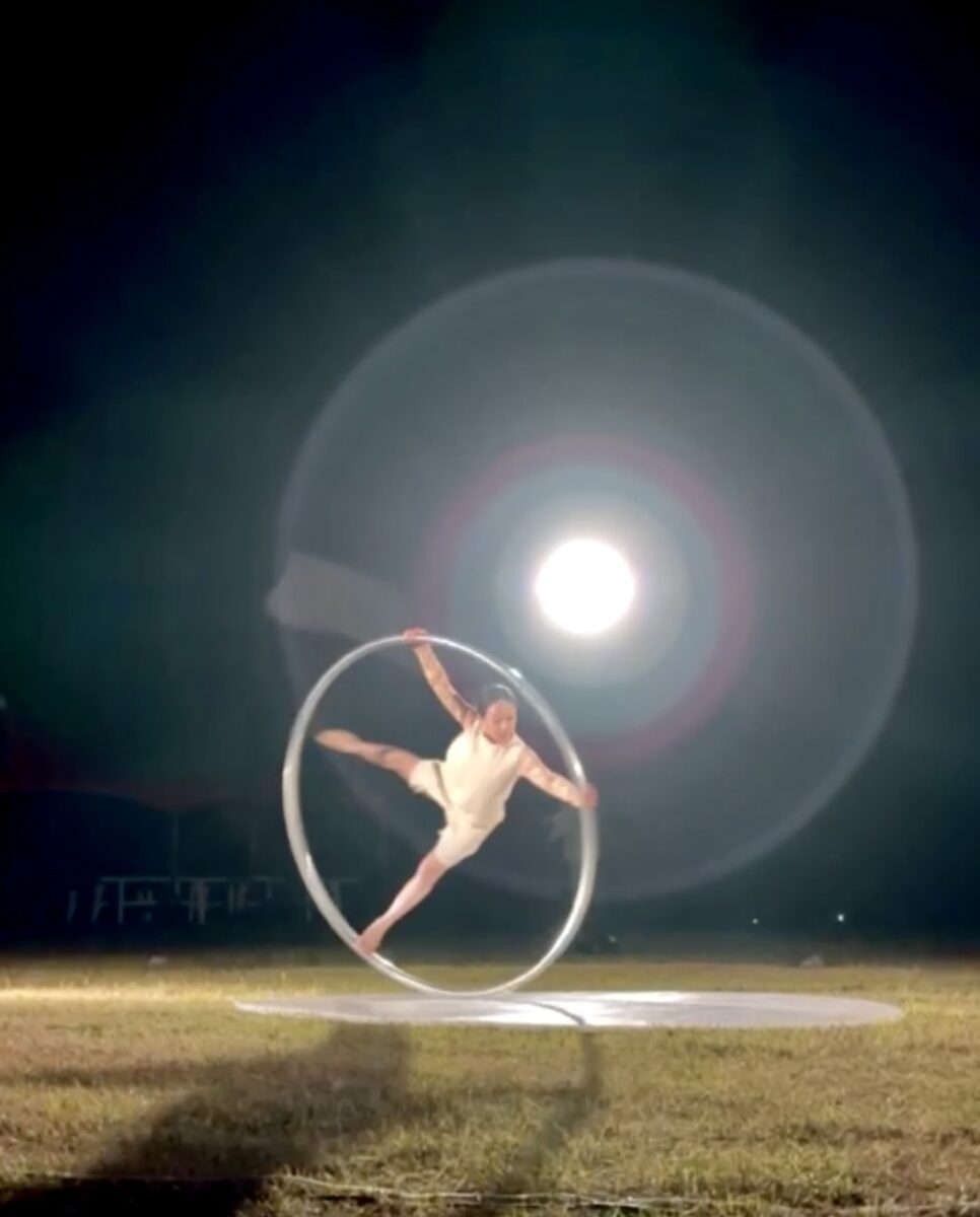 大旗が風をまとい、シルホイールが光をなぞる、自然を感じるサーカス