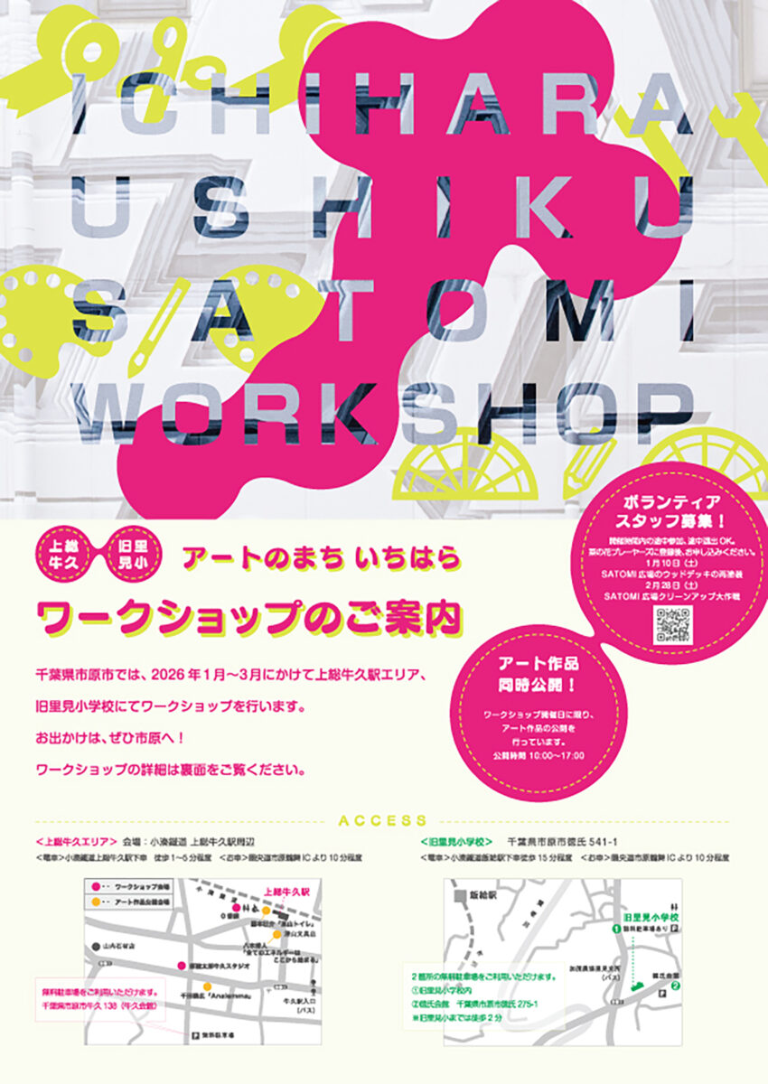 千葉県市原市では「アートのまちいちはら」の拠点のひとつである上総牛久駅周辺、旧里見小学校でワークショップ、アート作品展示を行います。