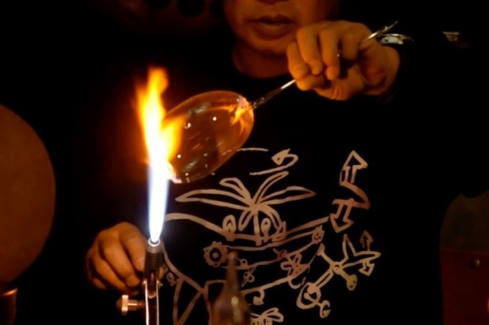 吹きガラスの技法を用いて、雲型オブジェを作ります。