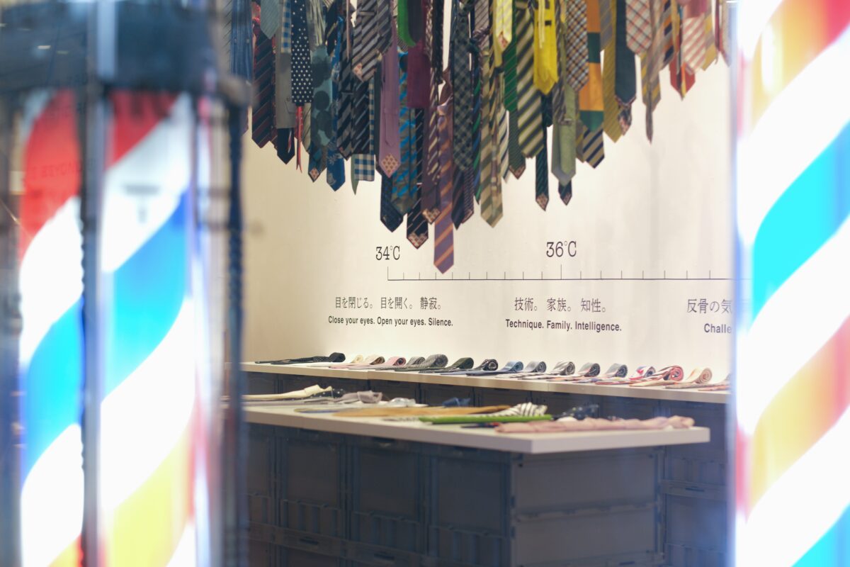 giraffe のアイコニックな展示スタイル(通称:ナイアガラ)で、時代は変われど冷めることのないネクタイ愛を表現しています。