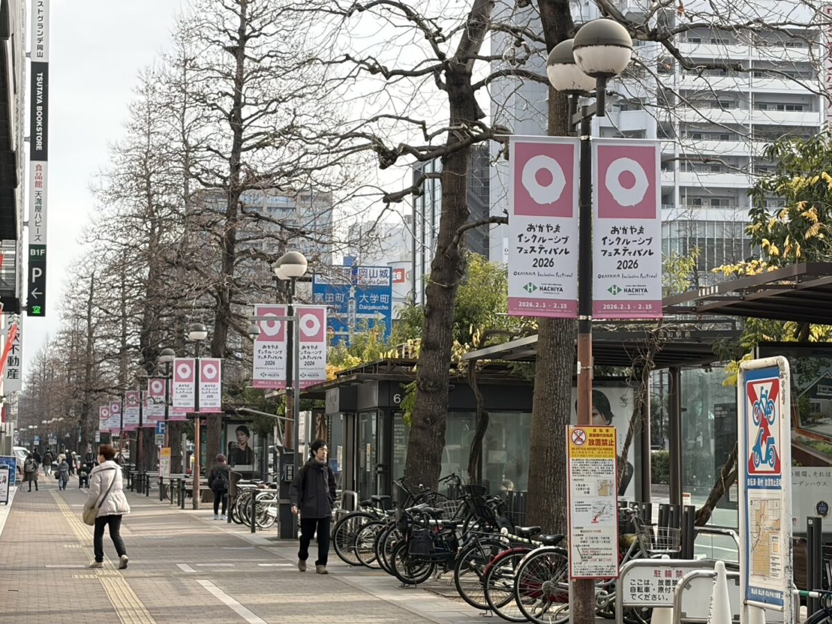 ・桃太郎大通りのフラッグが1ヶ月間フェスティバル仕様に