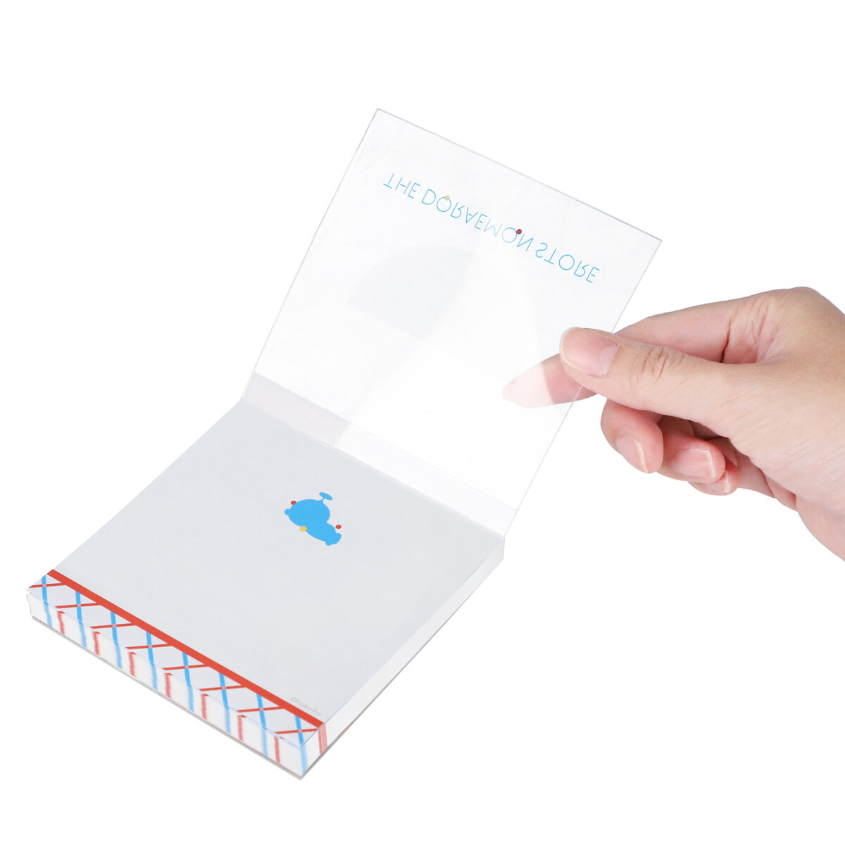 THE DORAEMON STOREのロゴマークをあしらった、ブロックメモです。コンパクトなサイズ感で持ち運びしやすく、クリアカバーには角度を変えると見え隠れする、同色の四次元ポケットをデザインしました。