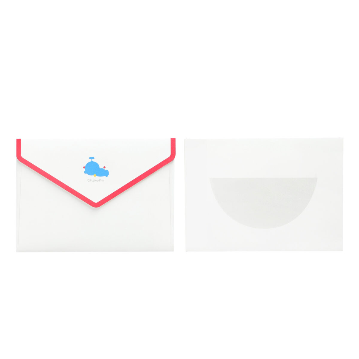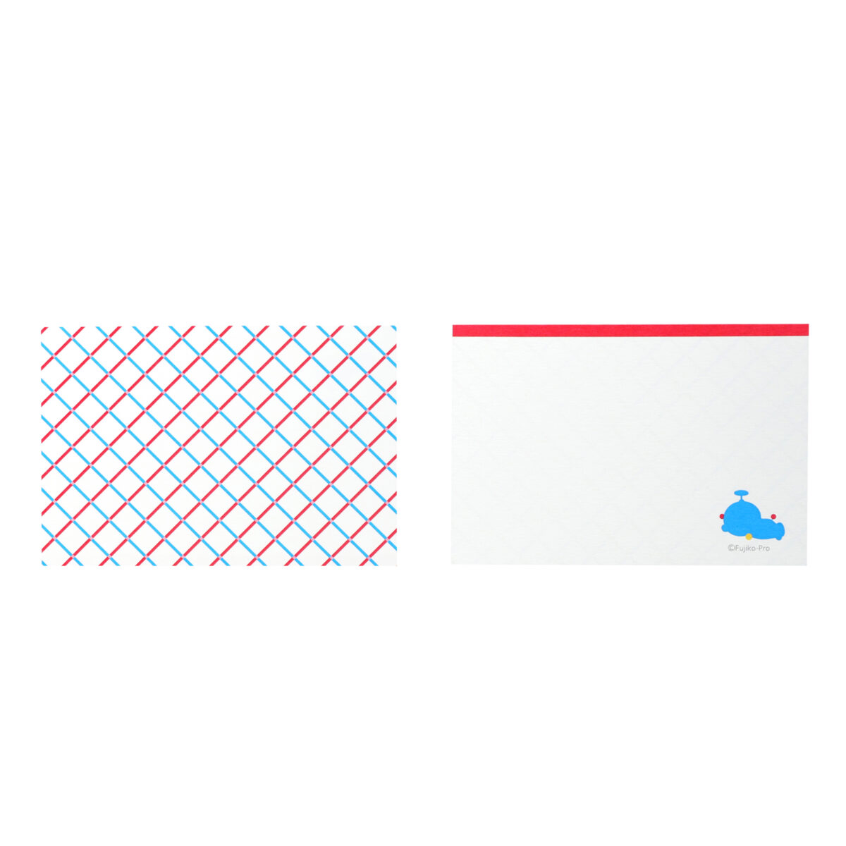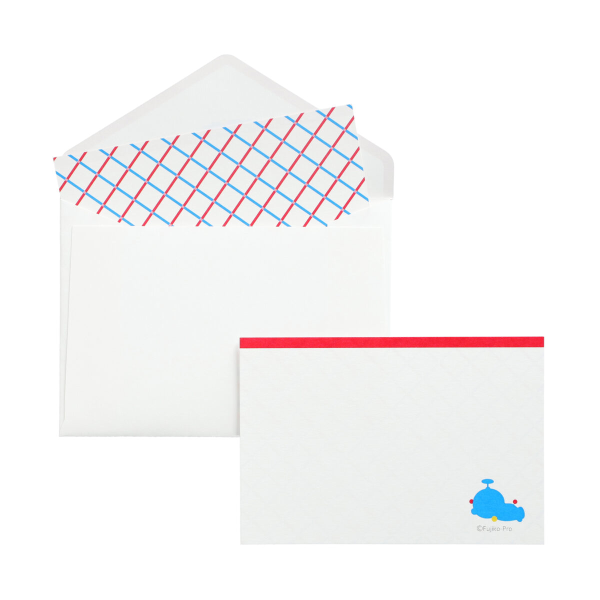 封筒とメッセージカードの表面にTHE DORAEMON STOREのロゴマークをあしらった、メッセージカードセットです。封筒の裏面には四次元ポケット、メッセージカードの裏面にはドラえもんをイメージしたチェック柄をデザインしました。