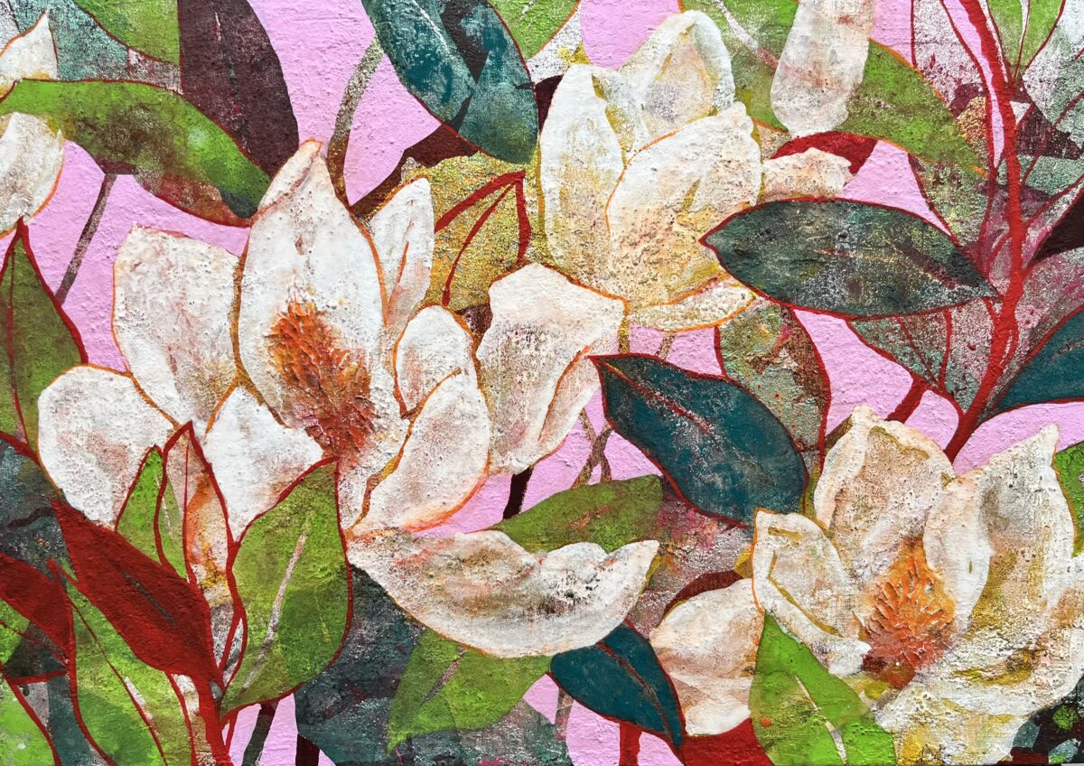 幼少の頃より親しまれてきたお庭の八重桜。これまでに沢山描かれているモチーフで今展でも3連パネル作品で大きく展開いたします。また葡萄の四季折々の変化に魅力を感じられ、日本古来の自生の山葡萄を探しに行かれることも。