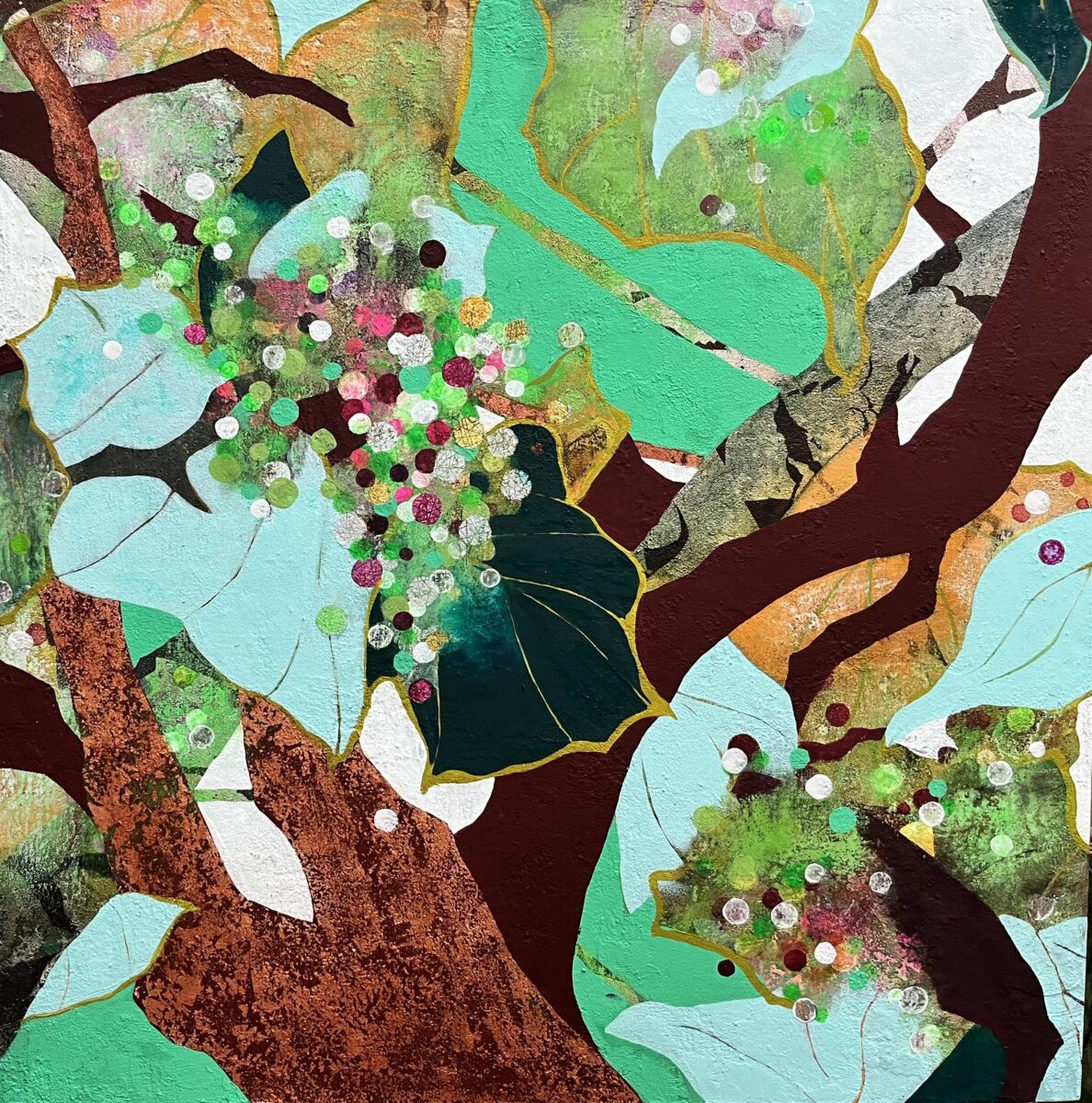 日本画の伝統技法を基盤としながら、現代的な感覚をもって自然や生命の在り方を静かに、そして深く描き出します。画面には「生命の重なり」を感じさせる温かさが満ち、穏やかな佇まいの中に確かな存在感が宿っています。