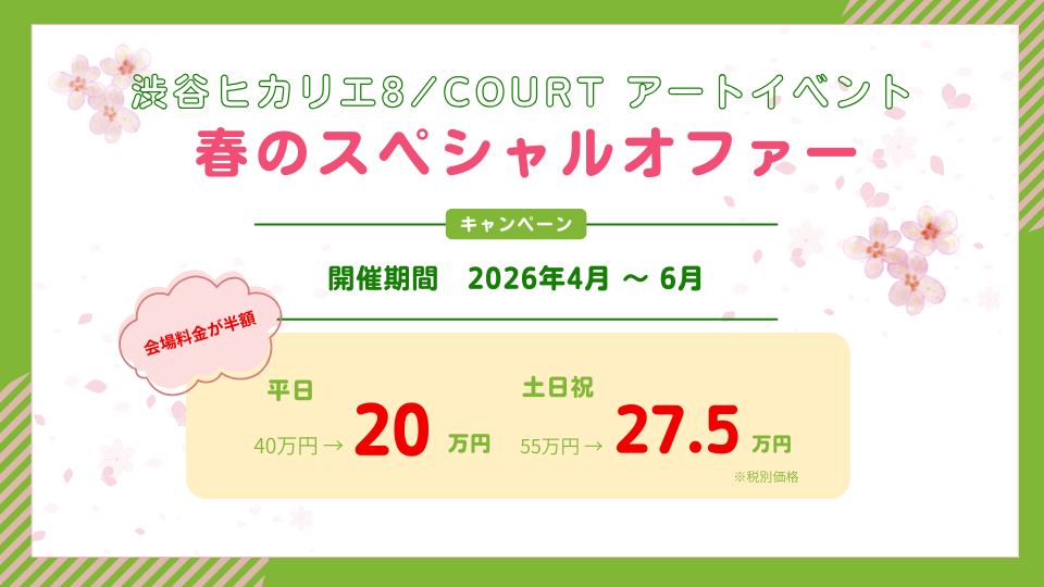 2026年4月~6月開催するアート展示やアートに関するイベント向けに、特別料金で会場をご利用いただけます。※詳細はお問合せください。