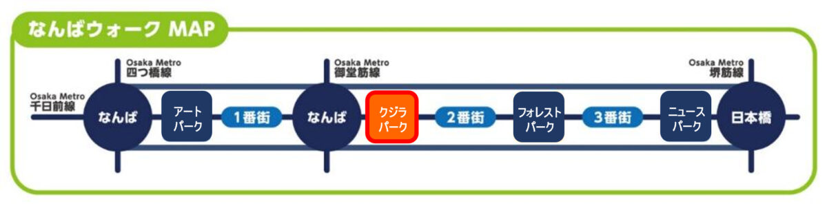 Osaka Metro御堂筋線なんば駅を基軸に東西延長715mにおよぶなんばウォークは、東端の堺筋線日本橋駅から西は四つ橋線なんば駅までを結ぶショッピングストリート。北通り南通りの2本の通路で構成された街は大きく3つのゾーンに区分けされています。「クジラパーク」「フォレストパーク」をはじめとする広場はシンボルモニュメントのある「たまり空間」で、季節ごとのイベントが行われています。1番街の「アートパーク」にはシカゴ美術館所蔵作品の複製陶板画が並ぶシカゴギャラリーがあり、道行く人々の目を楽しませています。