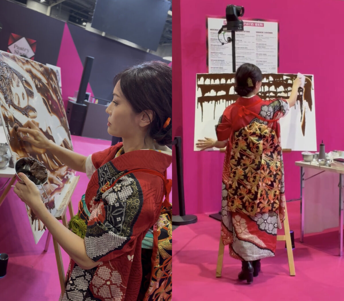 作品によっては制作過程で生まれる余剰チョコレートや試作用の材料を再活用しながら、濃淡だけで人物や花、物語を描く独自の技法を確立。国内外のイベントでライブペインティングを行い、繊細な筆致と立体感ある表現が評価されている。