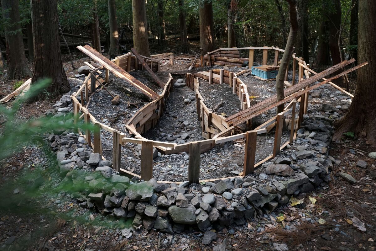 天地耕作は、静岡県浜松市を拠点に活動し、独自の表現によって高く評価されてきたユニットです。本作ではかつて社殿があった場所を掘り、地中から現れた石や土と向き合いながら、新たな壇と仮設の構築物を立ち上げます。掘るという行為を通して、この土地に残る記憶や時間の重なりを現在に呼び起こし、場所の成り立ちをあらためて見つめ直します。芸術祭初参加となる本制作は、次年度へと続く長期的な取組となります。