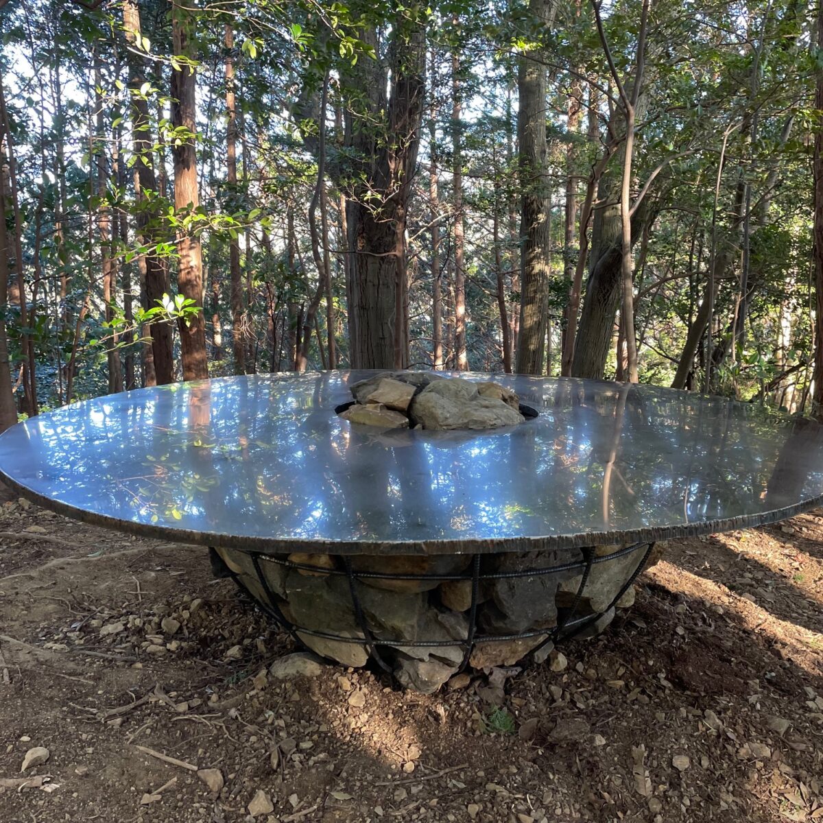 現代で目にする「管理された自然」と、人間が制御できない「根源的な自然」。本作品はこの二つの自然の姿を同一の時と場所に出現させる。磨かれた鉄は周囲の景色を切り取るが、徐々に表面は錆びていく。「管理された=切り取られた自然」が、自然へ還ろうとする様は、人工物と自然の境界を曖昧する。すべての形あるものを飲み込む大きな循環の在り方を鑑賞者に問いかける。