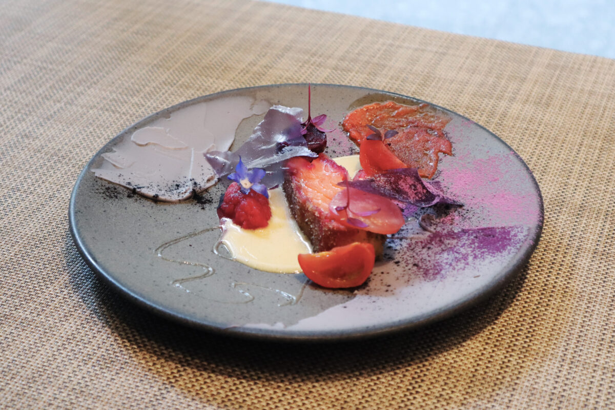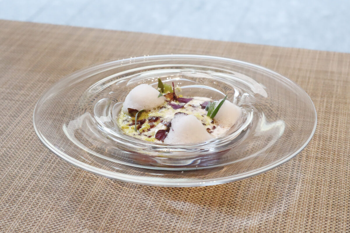 砕いたカダイフとパルメザンチーズをまとわせたサーモンのカツレツに、ノーザンルビーやカリフラワーなどの野菜のピューレ、サフラン香るバターソースを合わせました。