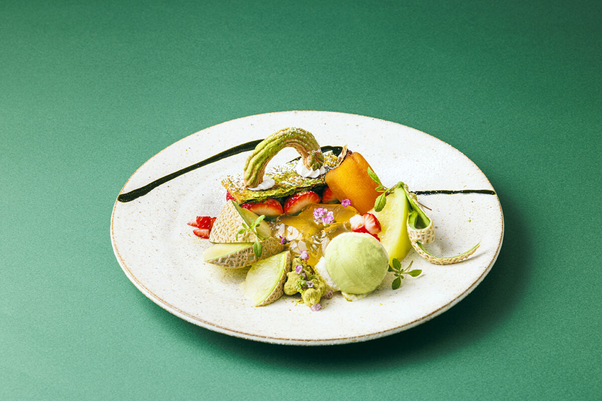 緑を基調とする絵画のイメージに寄り添う果物として、京橋千疋屋の顔ともいえる「マスクメロン 」をあしらったプレートデザート、どうぞお楽しみください。