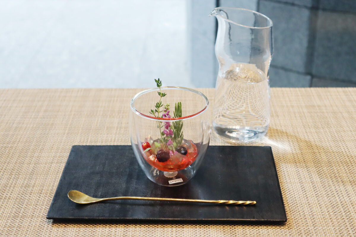 低温で火を入れた和牛肉を季節の野菜とマリネし、コンソメのジュレを流し入れた冷製のポトフです。
