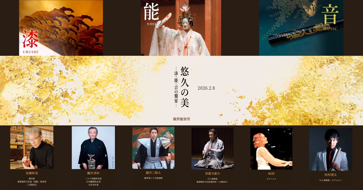 2026年2月8日(日)、観世能楽堂(GINZA SIX 地下3階)にて、舞台公演「悠久の美 ― 漆・能・音の饗宴」 を開催いたします。