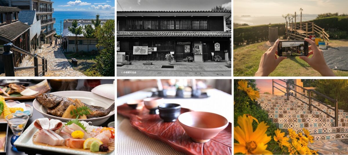 きらきら坂: 海面が「きらきら」と輝くことから名付けられた、赤穂御崎の注目スポット。おしゃれなカフェや雑貨店が並び、白い壁と青い海のコントラストはまるで地中海のよう。フォトジェニックな絶景の中で、自由に街を歩き、自分も美しい景色の一部になったような気分を満喫できます。