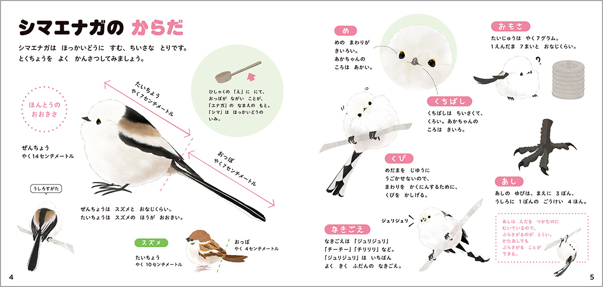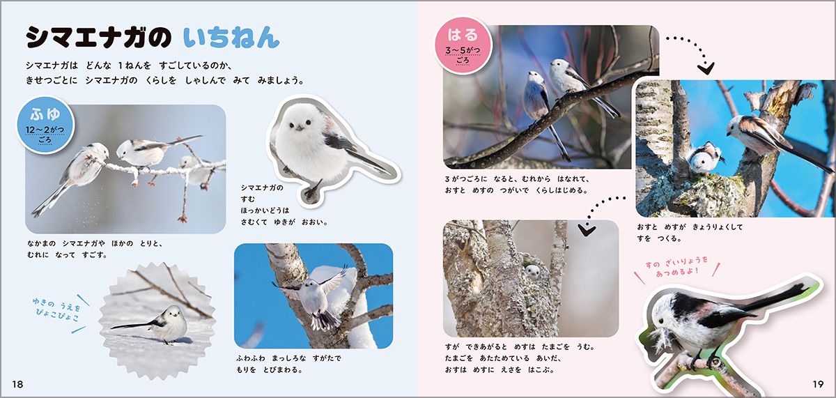 シマエナガの可愛い姿や飛び方、食べ物、子育てなどさまざまな生態を、たくさんのイラストとともに、わかりやすく紹介しています。