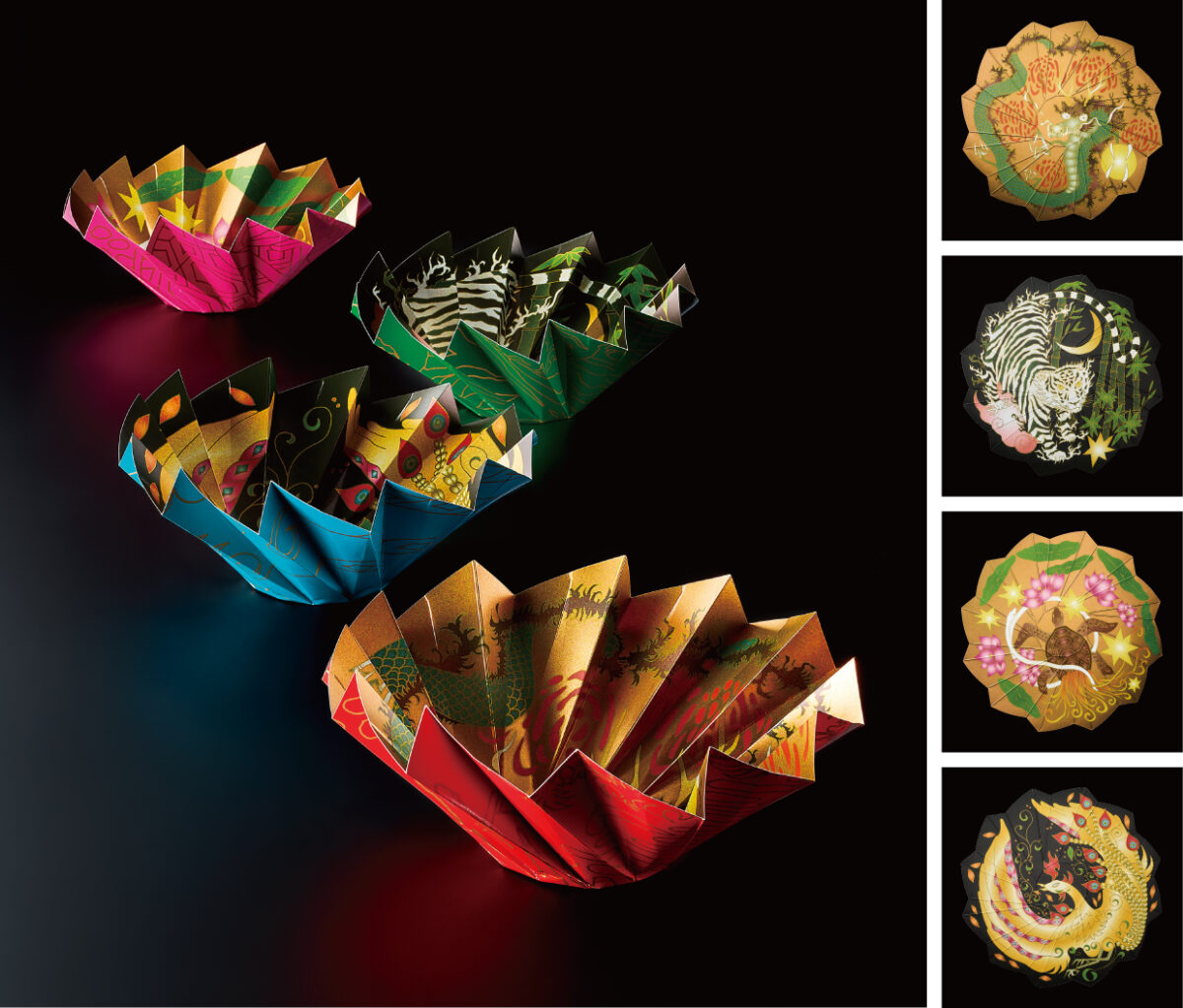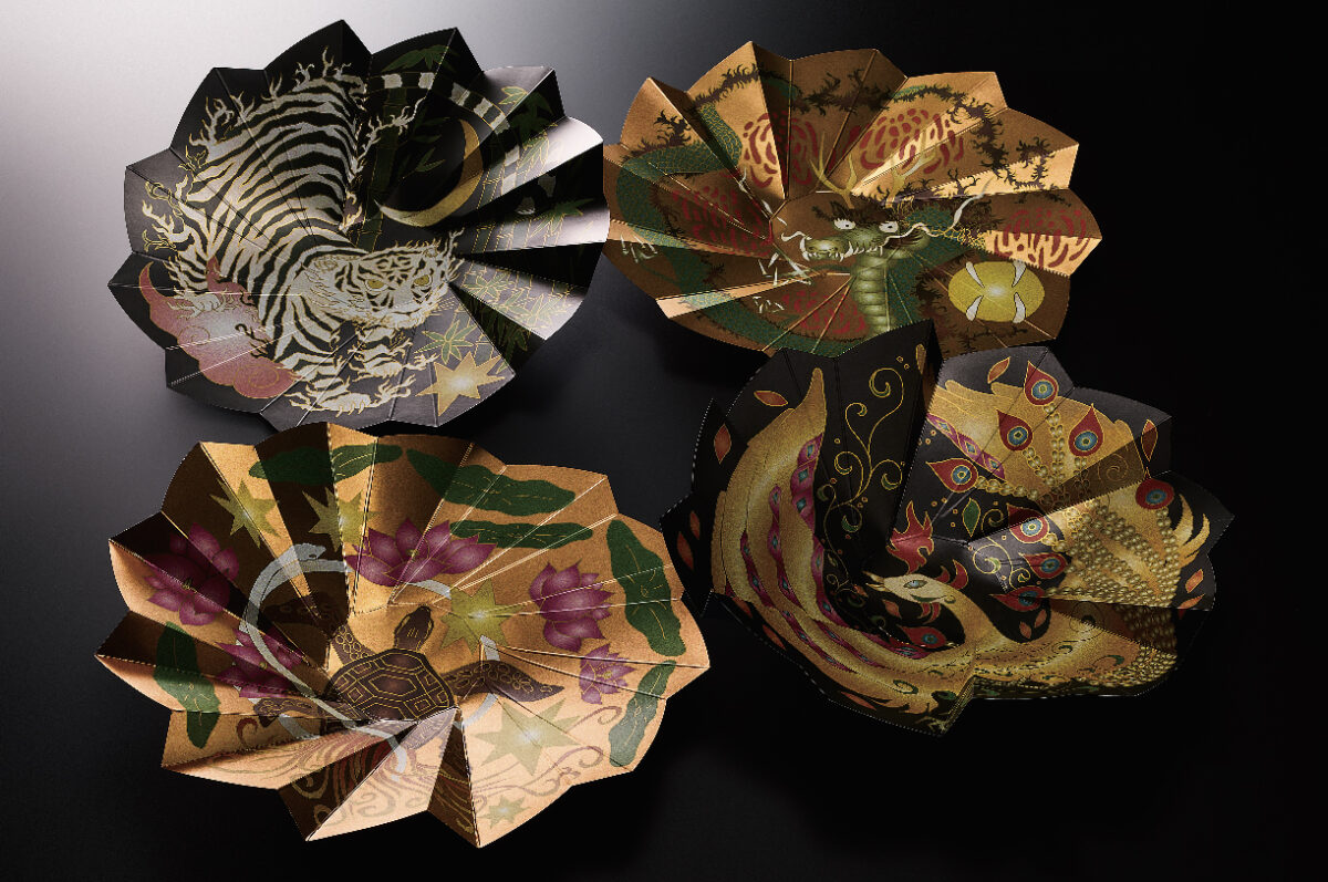 絵柄は、古代中国で生まれ日本の古墳や建築設計にも大きな影響を与えた四神をモチーフに、龍・虎・亀・鳥の4種をセット。