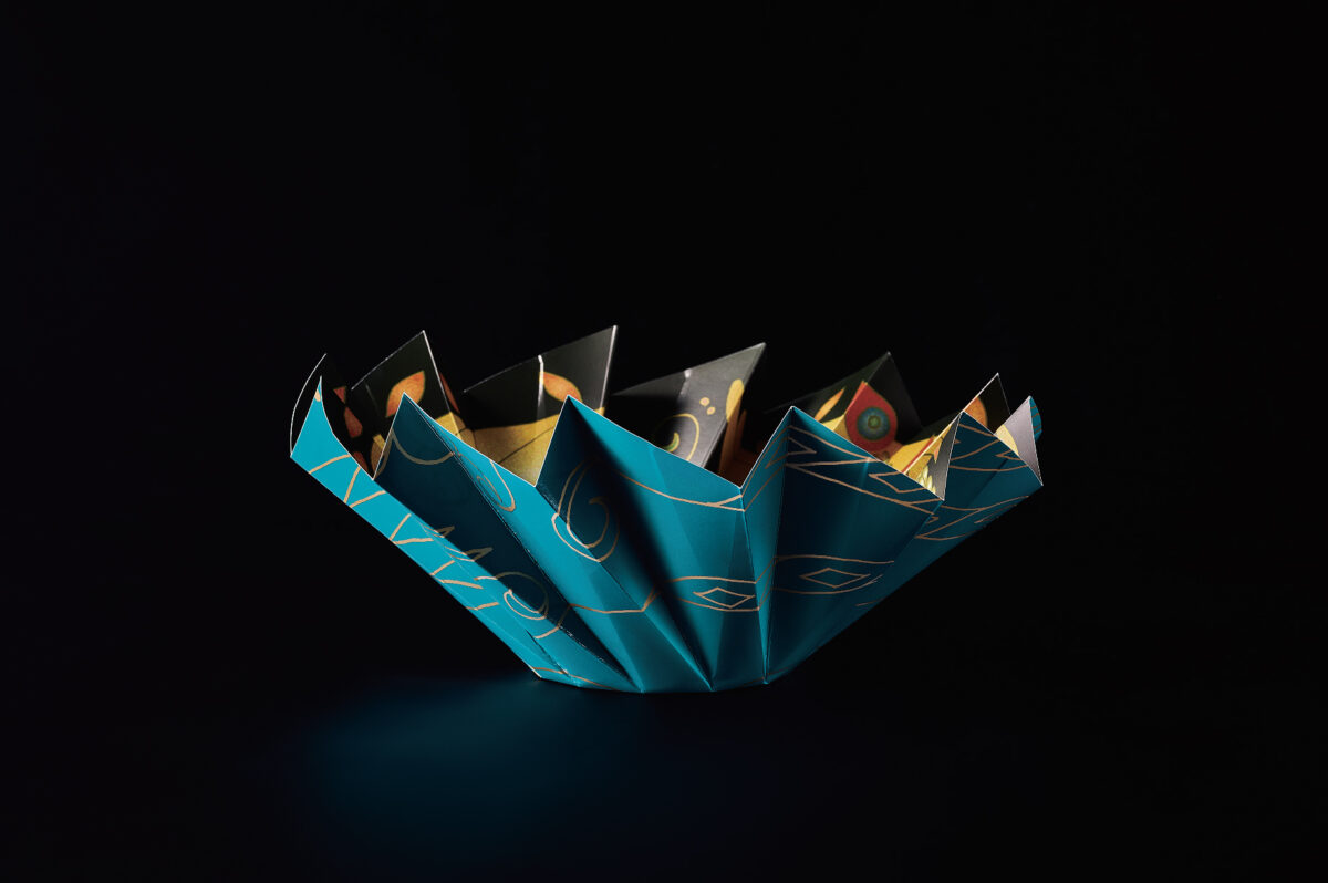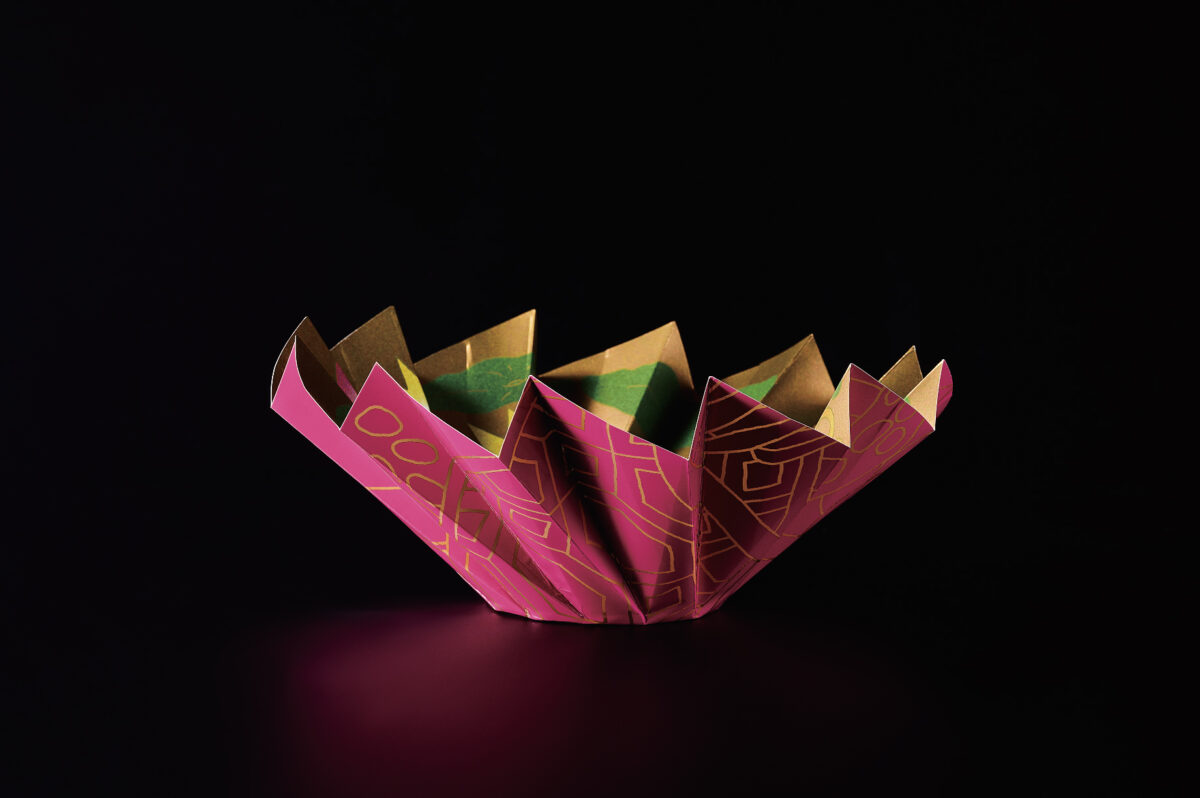 日本の文化おりがみの発想をもとに、円形の紙をジャバラに折って作った容器。