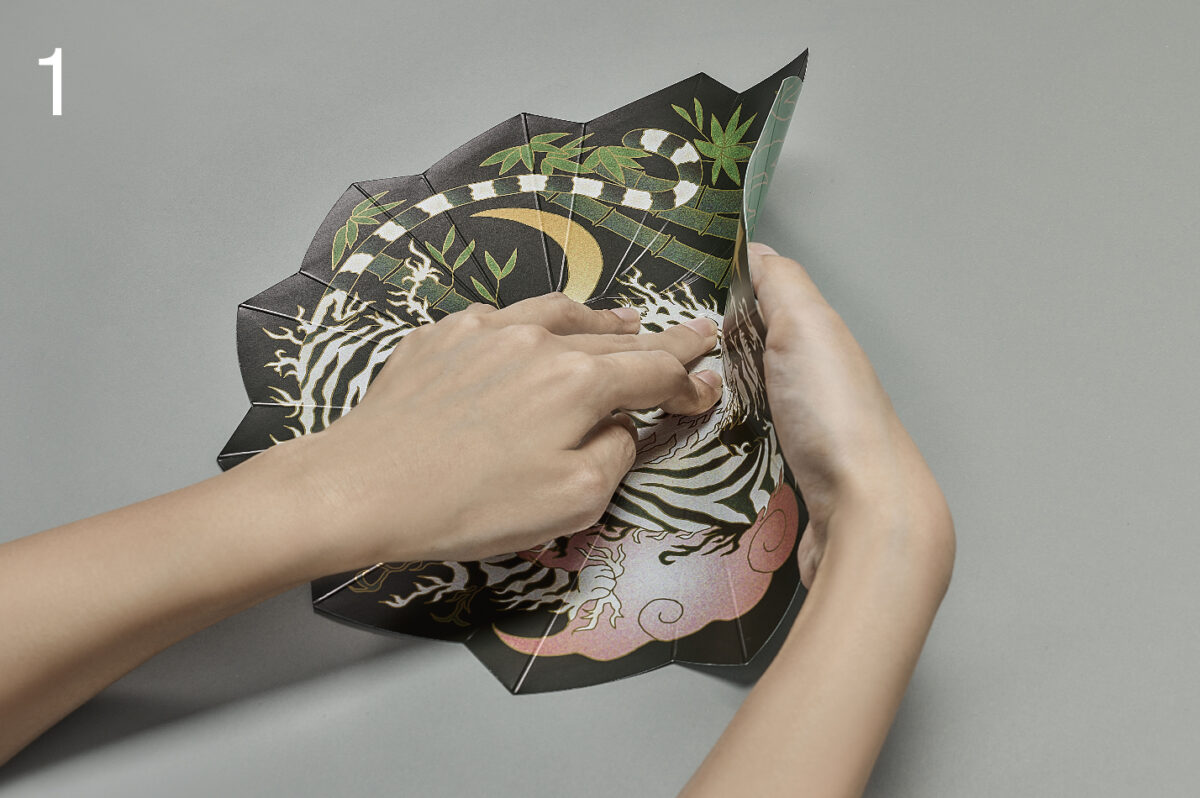 絵柄面を見ながら外側に 飛び出している部分を山折りに。
