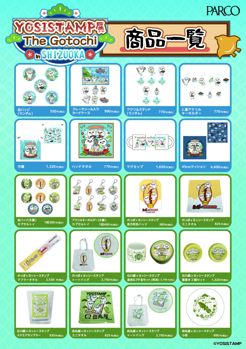 本展では、大ヨッシースタンプ展にご来場いただけなかった方々を初め、多くのファンの皆様に楽しんで頂きたく、大ヨッシースタンプの立体展示や人気スタンプベスト100などの展示に加えて、本展のためにご当地アートワークを描き下ろし、ご当地企業様とのコラボレーションアートも展示に加えた「静岡バージョン」の展示となっております。また、既存商品に加え、静岡県企業で「のっぽパン」のバンデロール様、「わさび漬け」で有名な田丸屋本店様、「静岡名産お茶」の石川園様とのコラボ商品も販売し、ファンの皆様にその土地土地でしか味わえないモノコトを楽しんでいただける展覧会となっております。